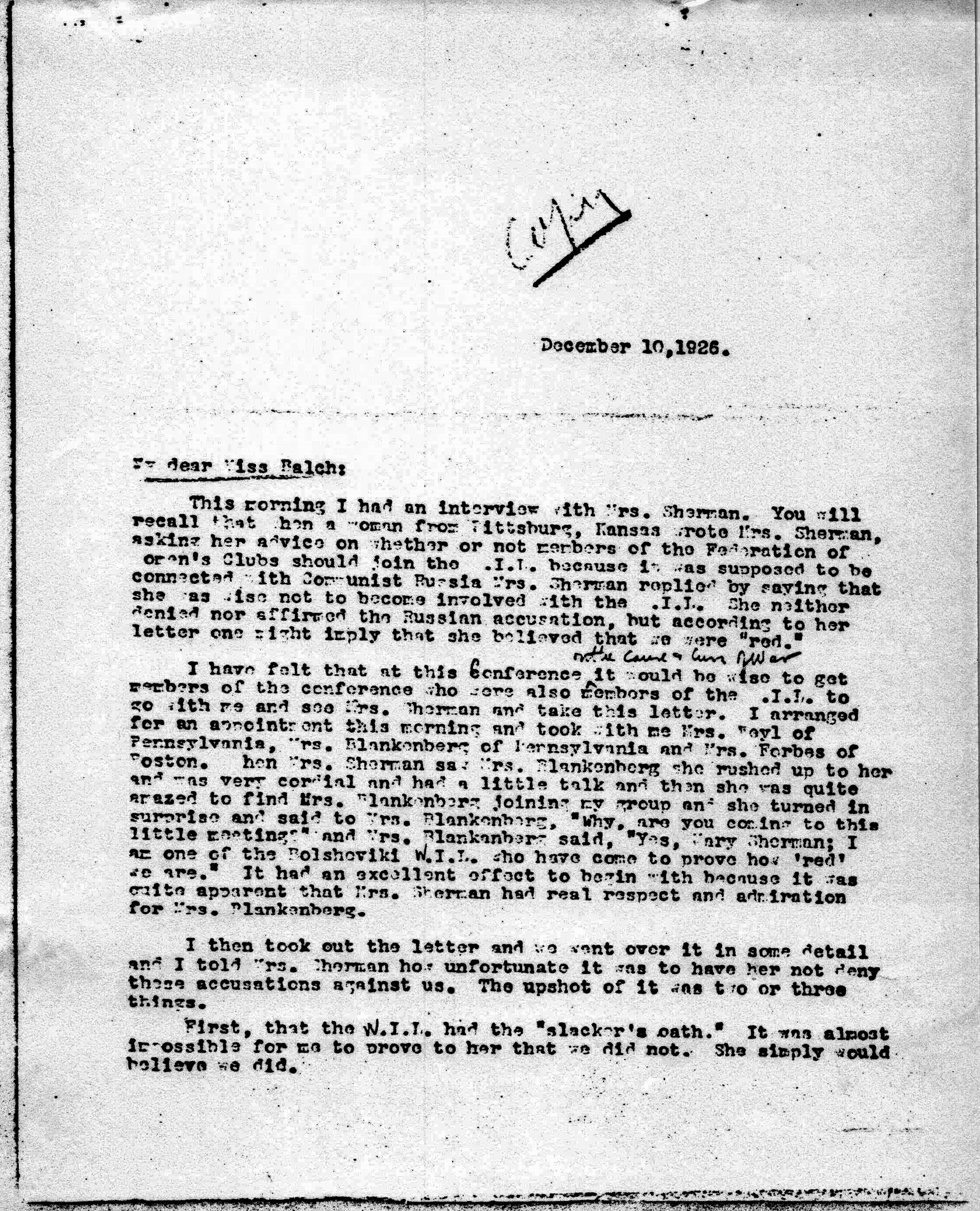 This morning I had an interview with Mrs. Sherman. You will recall that when a woman from Pittsburg, Kansas wrote Mrs. Sherman, asking her advice on whether or not members of the Federation of Women's Clubs should join the [W.I.L.] because it was supposed to be connected with Communist Russia Mrs. Sherman replied by saying that she was wise not to become involved with the [W.I.L.] She neither denied nor affirmed the Russian accusation, but according to her letter one might imply that she believed we were "red."