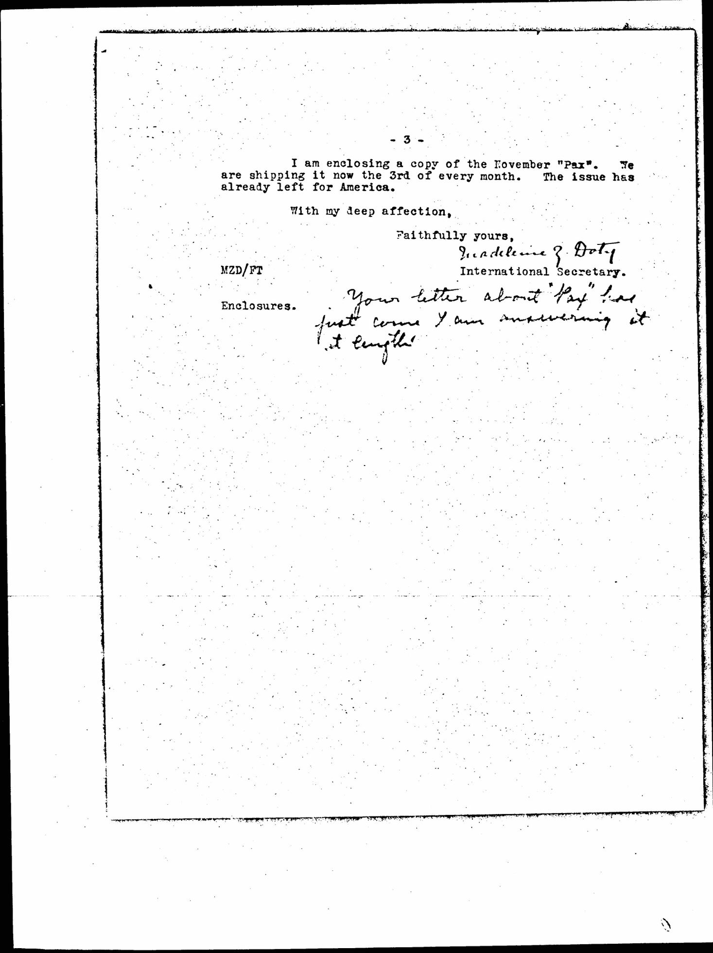 I am enclosing a copy of the November "Pax." We are shipping it now the 3rd of every month. The issue has already left for America.