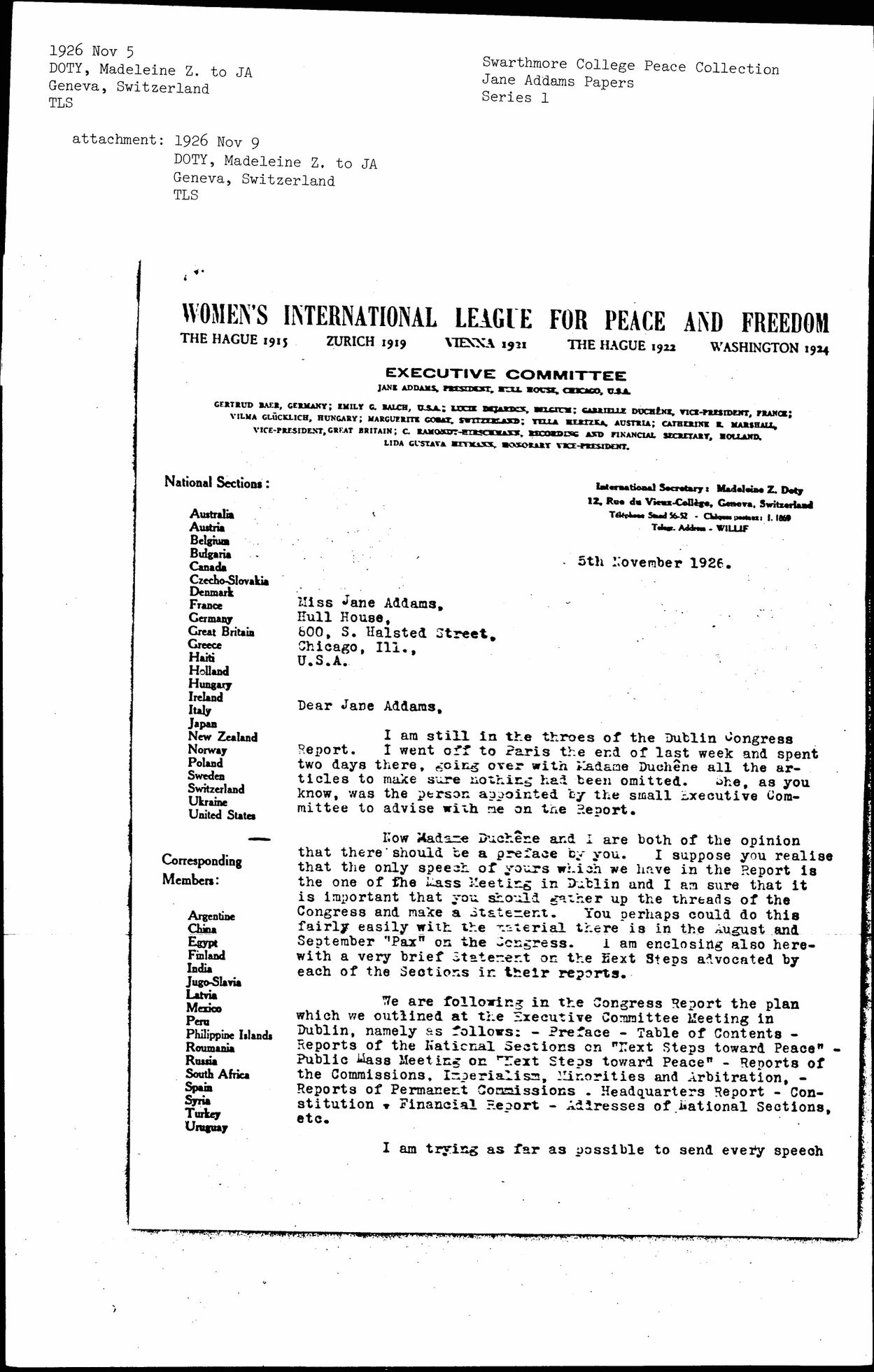 Now Madame Duchêne and I are both of the opinion that there should be a preface by you. I suppose you [realize] that the only speech of yours which we have in the Report is the one of the Mass Meeting in Dublin and I am sure that it is important that you should gather up the threads of the Congress and make a Statement. You perhaps could do this fairly easily with the material there is in the August and September "Pax" on the Congress. I am enclosing also herewith a very brief Statement on the Next Steps advocated by each of the Sections in their reports.
