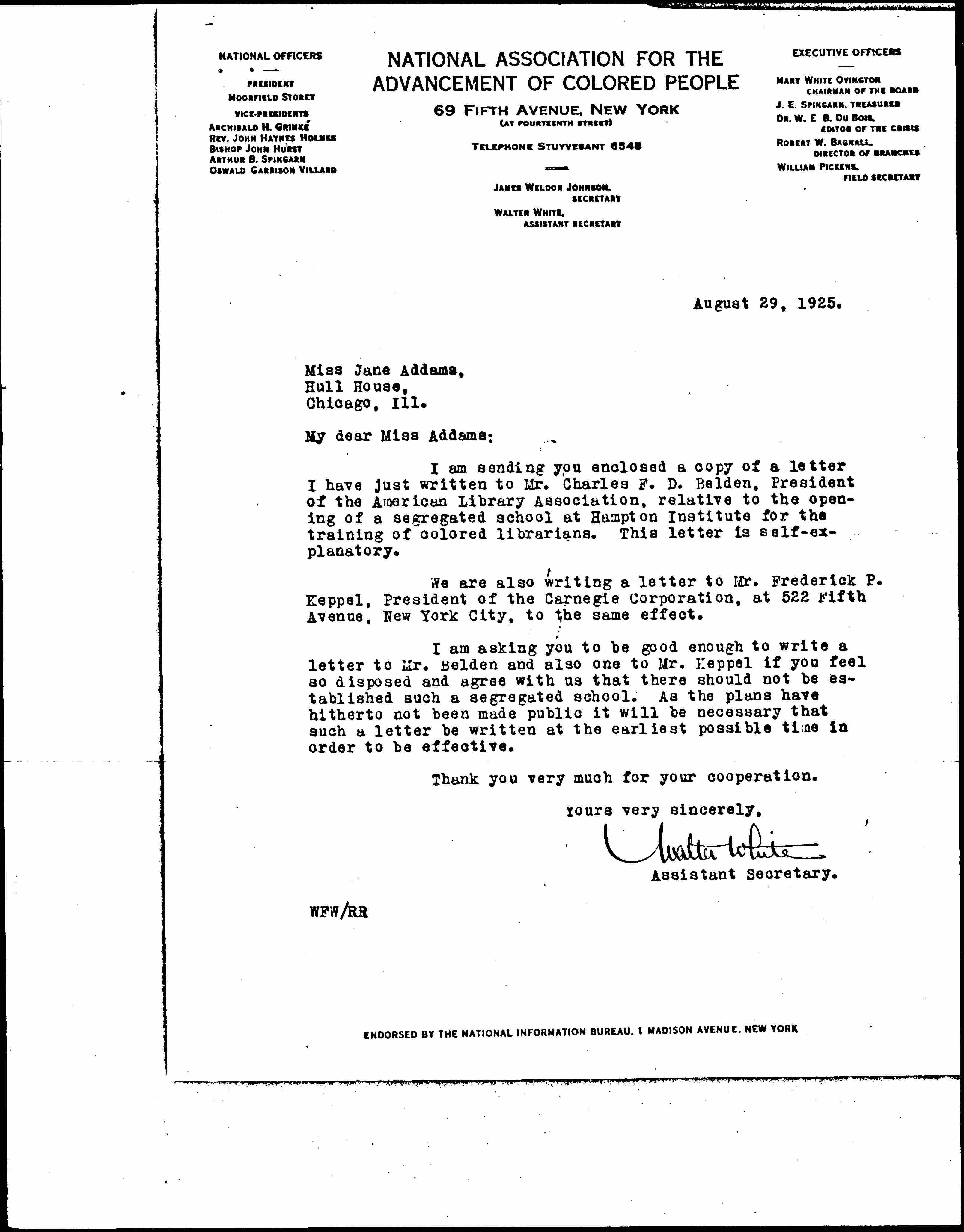 I am sending you enclosed a copy of a letter I have just written to Mr. Charles F. D. Belden, President of the American Library Association, relative to the opening of a segregated school at Hampton Institute for the training of colored librarians. This letter is self-explanatory.