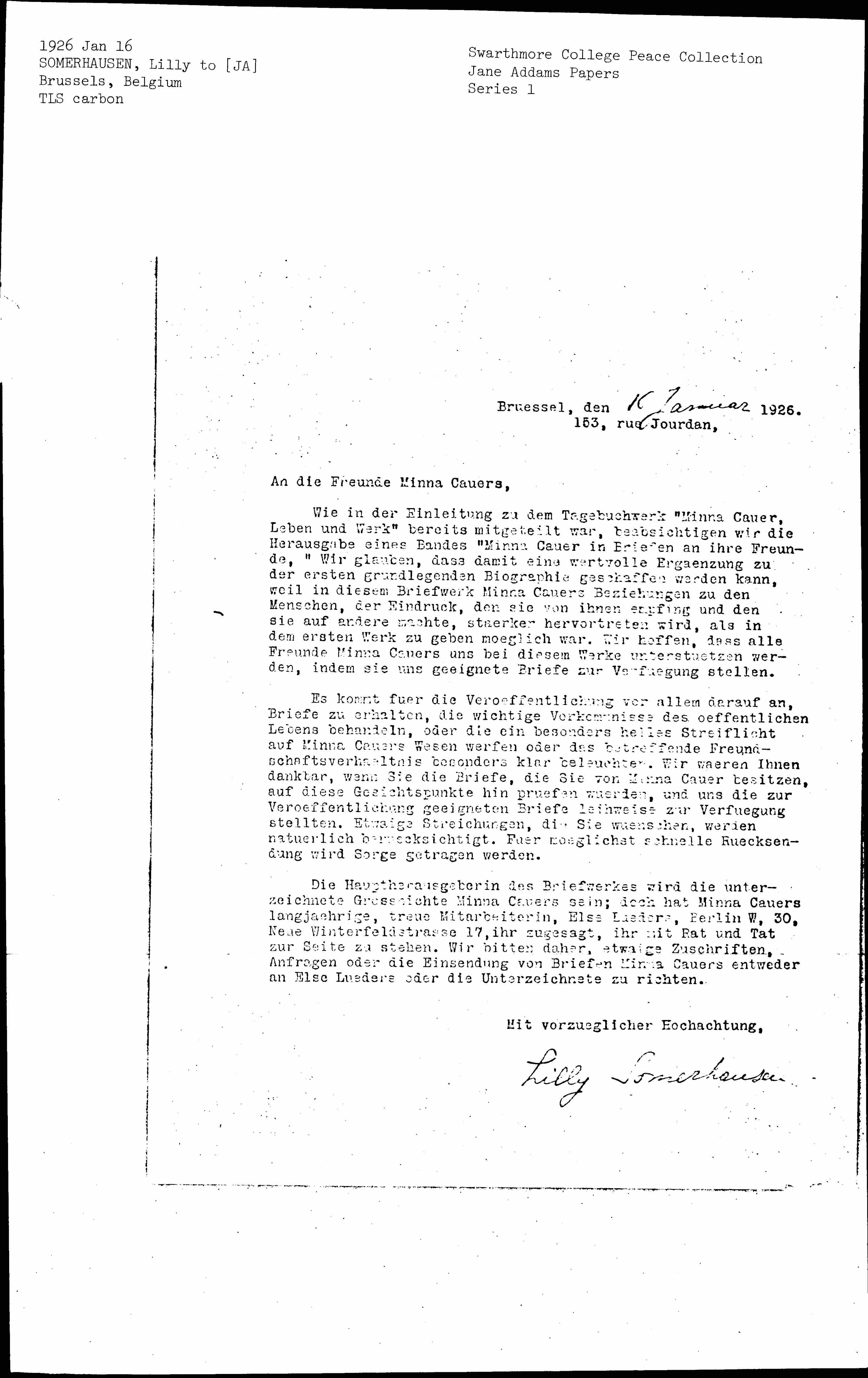 Die Hauptherausgeberin des Briefwerkes wird die unterzeichnete Gressnichte Minna Cavers sein; dech hat Minna Cauers langjaehrige, treus Mitarbeiterin, Else Laeders, Berlin W, 30, Neue Winterfeldstrasse 17, ihr sugesaft, ihr wit Rat und Tat zur Seite zu stehen. Wir bitten daher, etwaige Zuschriften, Anfragen oder die Einsendung von Briefen Minna Cauers entweder an Else Leuders oder die Unterzeuchnete zu richten.Mit vorzueglicher Eochachtung,