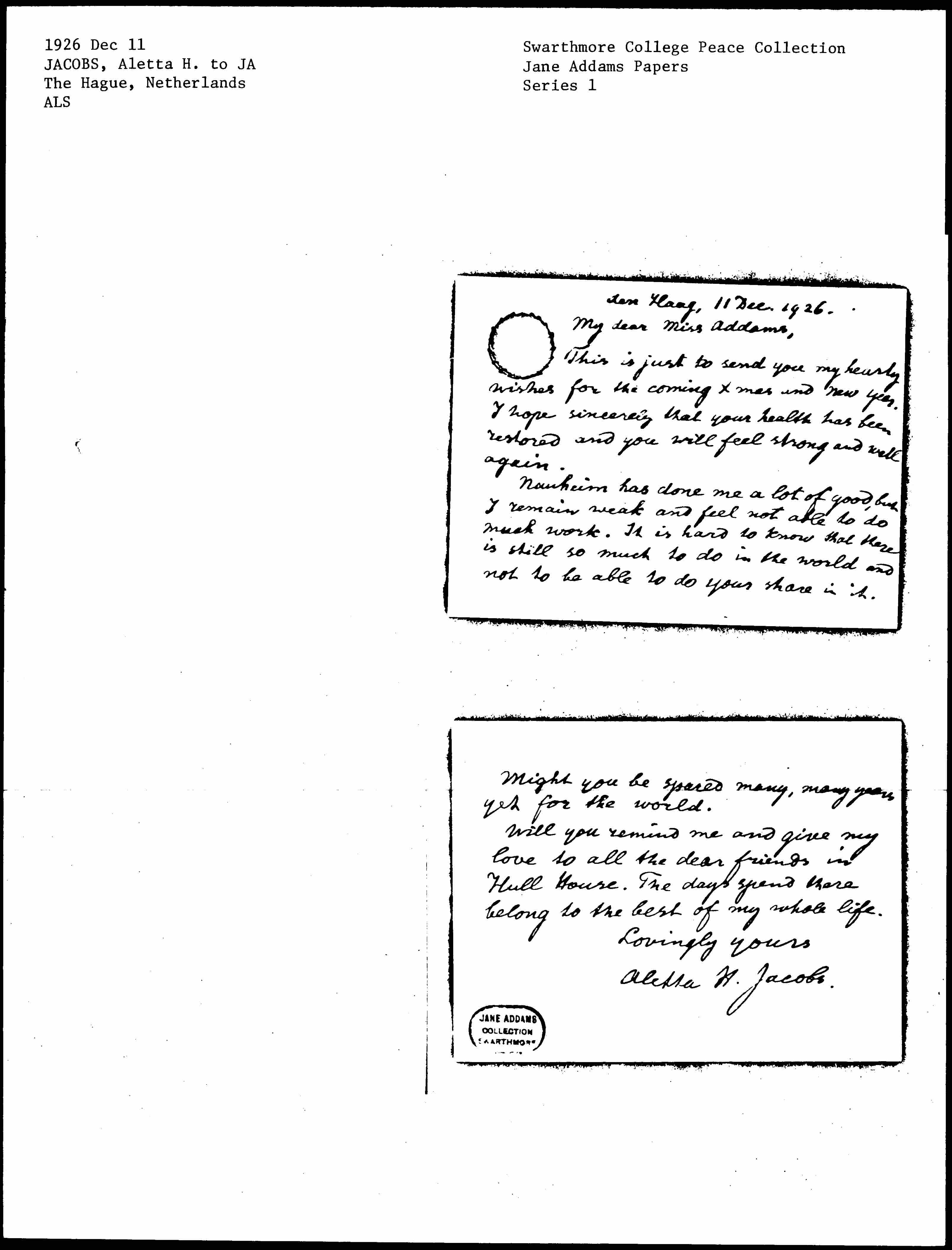 Will you remind me and give my love to all the dear friends in Hull House. The days spent there belong to the best of my whole life.