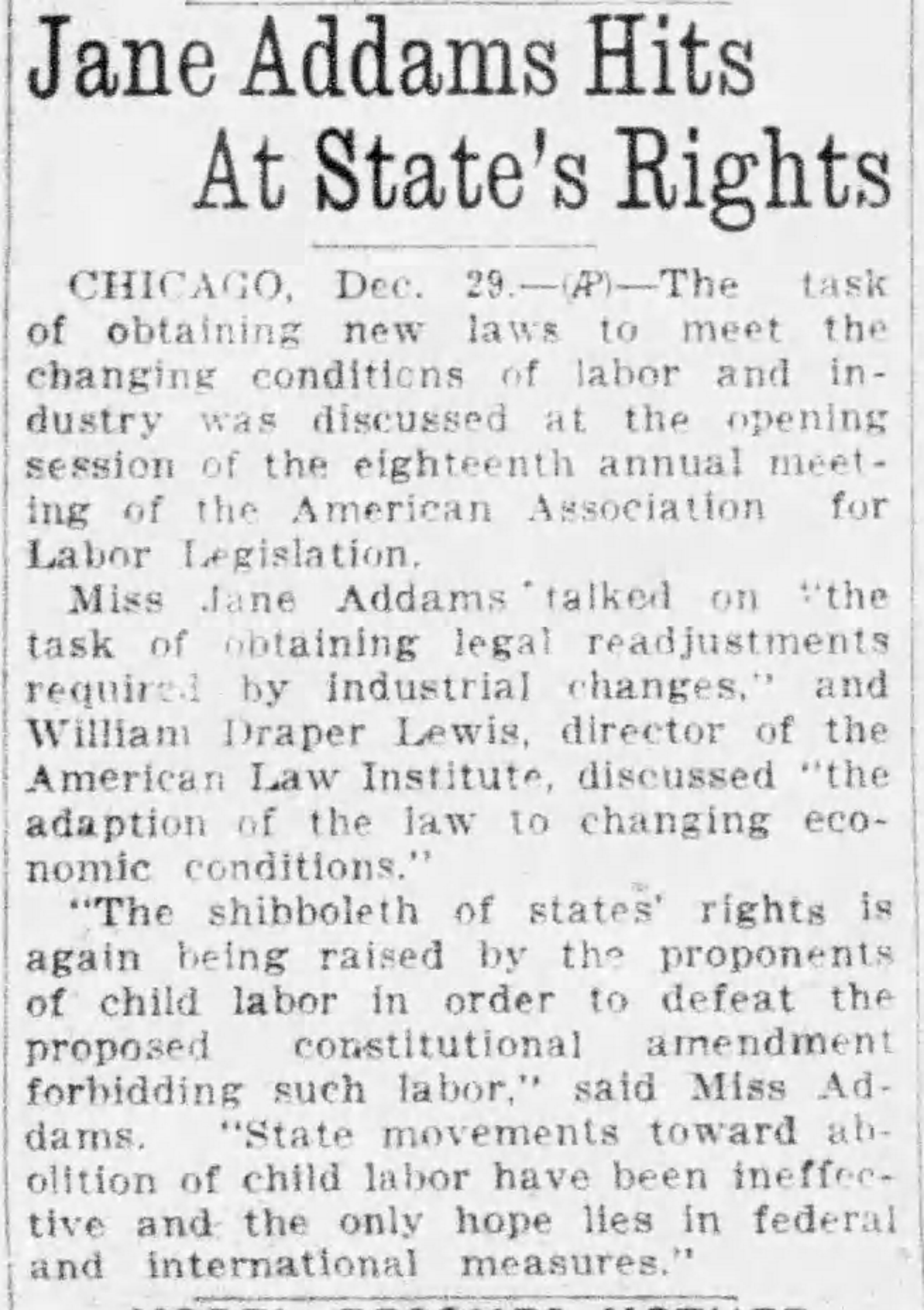 "The shibboleth of states' rights is again being raised by the proponents of child labor in order to defeat the proposed constitutional amendment forbidding such labor," said Miss Addams. "State movements toward abolition of child labor have been ineffective and the only hope lies in federal and international measures."