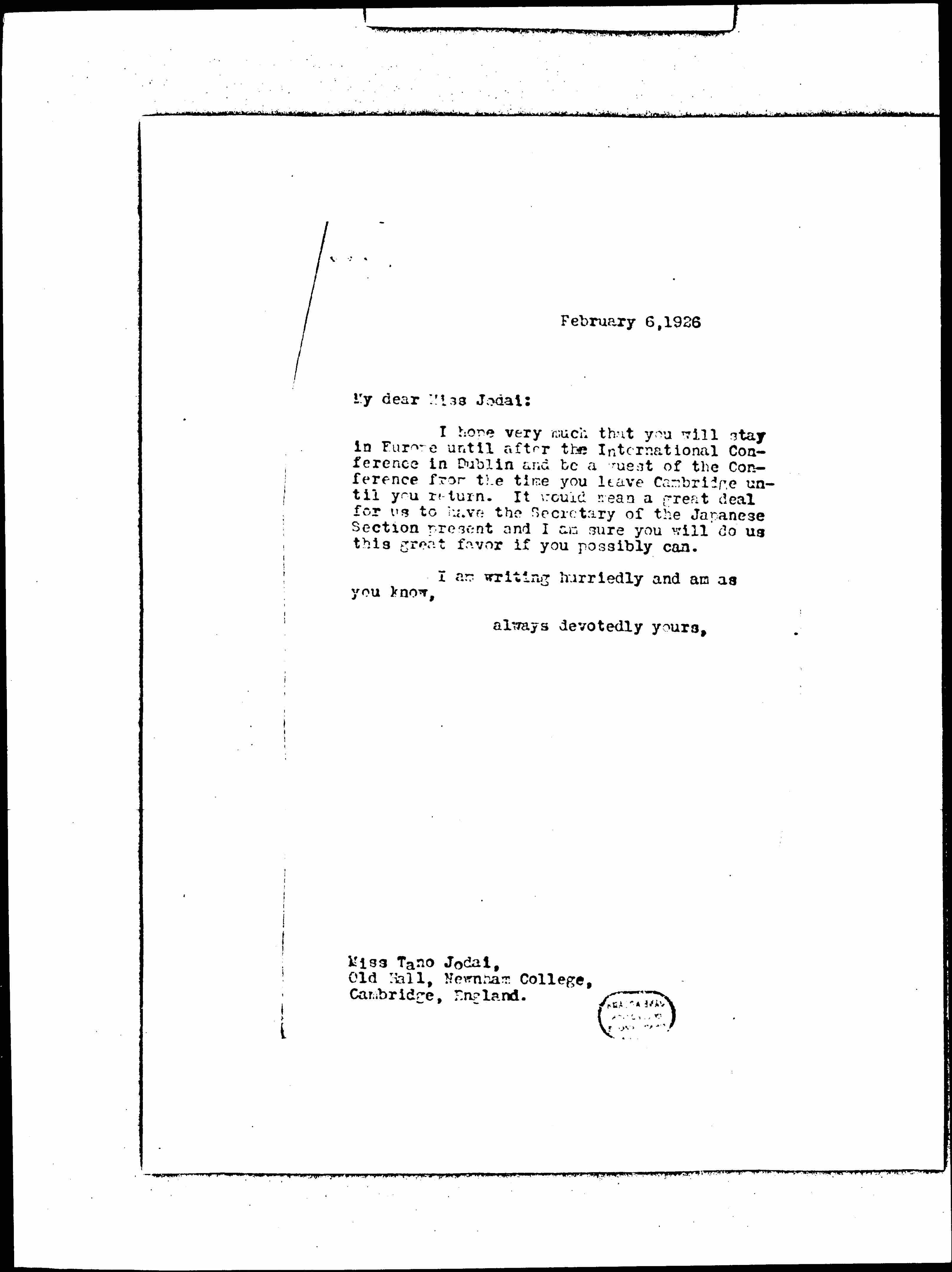 I hope very much that you will stay in Europe until after the International Conference in Dublin and be a guest of the Conference from the time you leave Cambridge until you return. It would mean a great deal for us to have the Secretary of the Japanese Section present and I am sure you will do us this great favor if you possibly can.