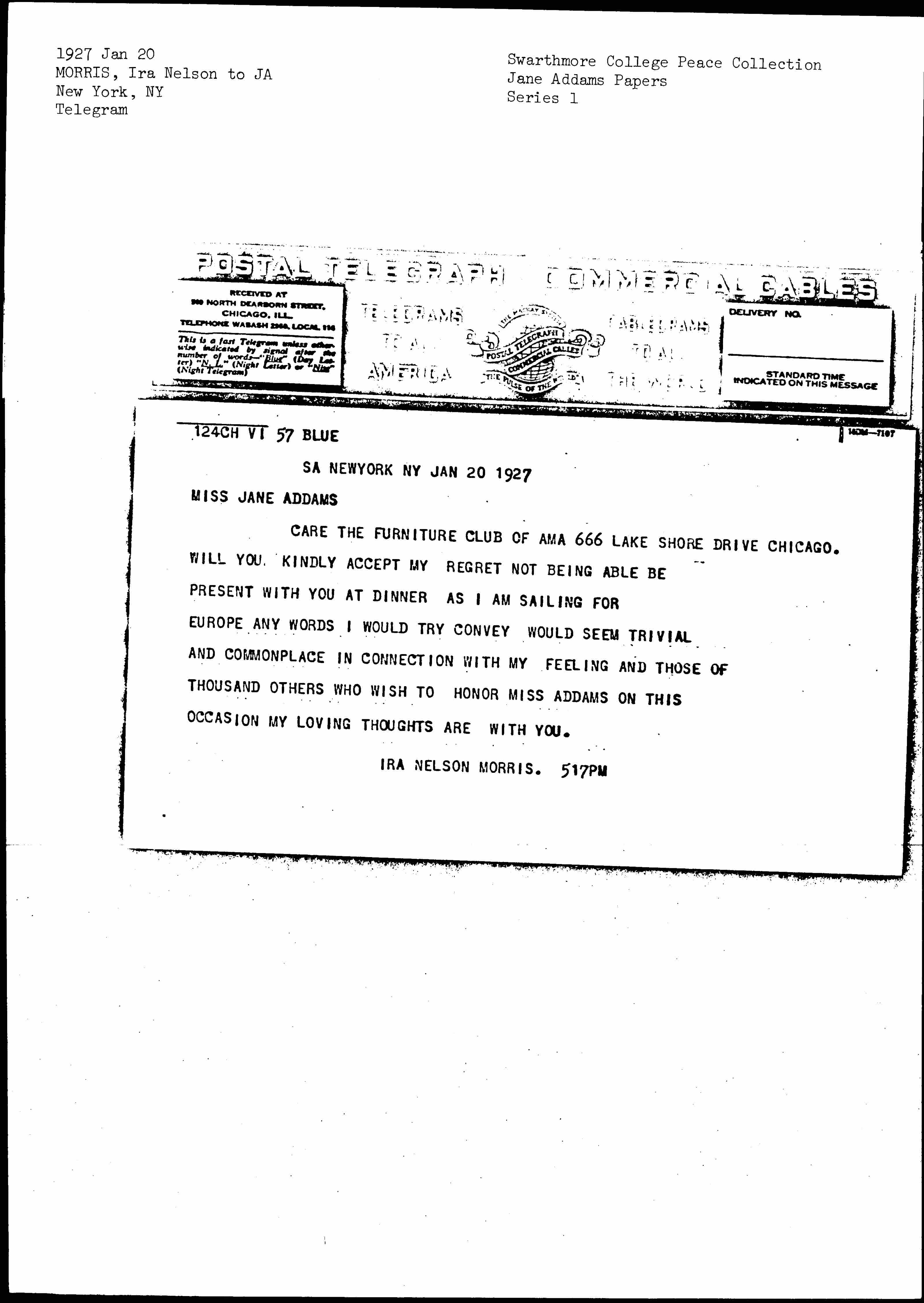 WILL YOU KINDLY ACCEPT MY REGRET NOT BEING ABLE BE PRESENT WITH YOU AT DINNER AS I AM SAILING FOR EUROPE ANY WORDS I WOULD TRY CONVEY WOULD SEEM TRIVIAL AND COMMONPLACE IN CONNECTION WITH MY FEELING AND THOSE OF THOUSAND OTHERS WHO WISH TO HONOR MISS ADDAMS ON THIS OCCASION MY LOVING THOUGHTS ARE WITH YOU.