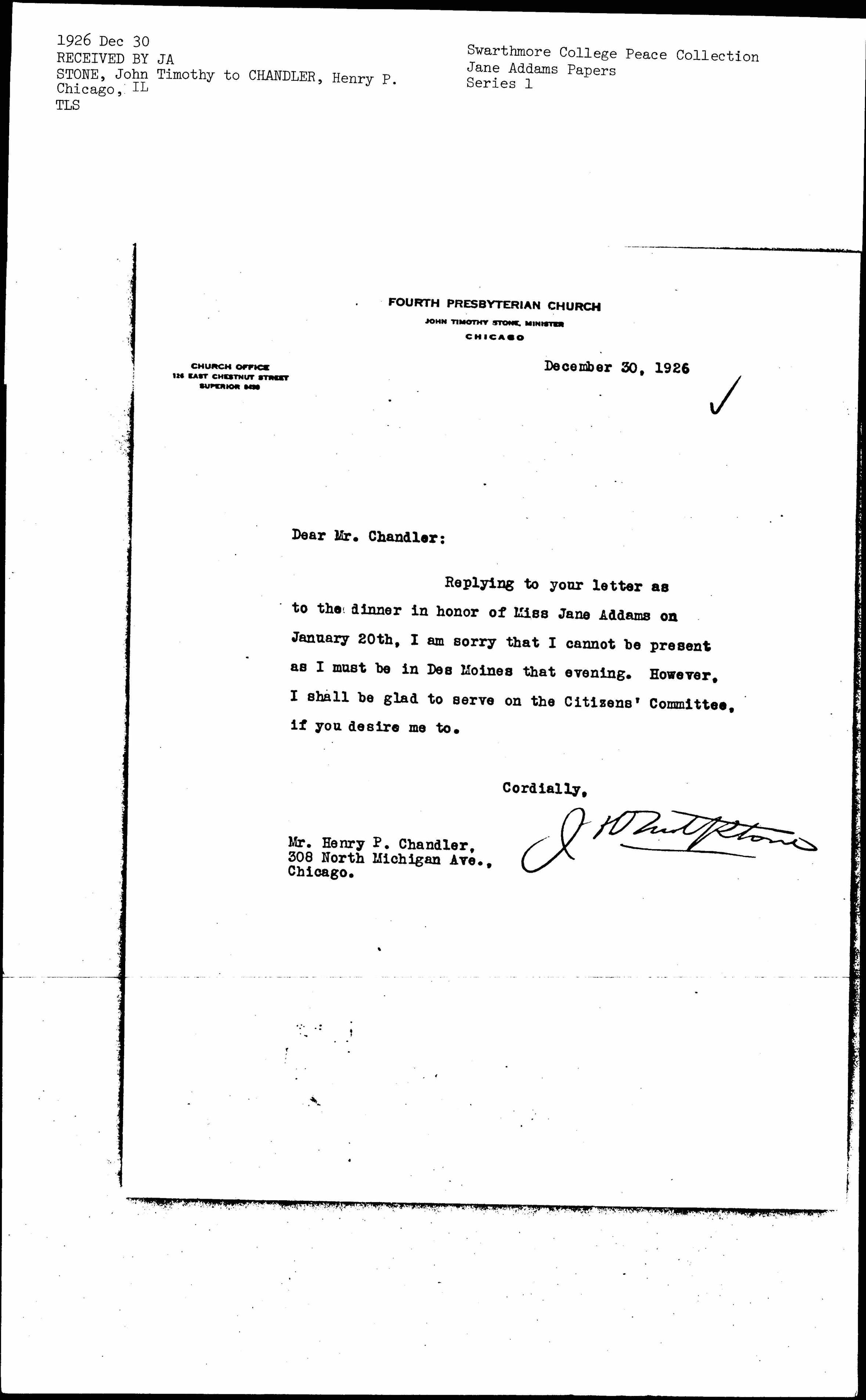 Replying to your letter as to the dinner in honor of Miss Jane Addams on January 20th, I am sorry that I cannot be present as I must be in Des Moines that evening. However, I shall be glad to serve on the Citizens' Committee, if you desire me to.