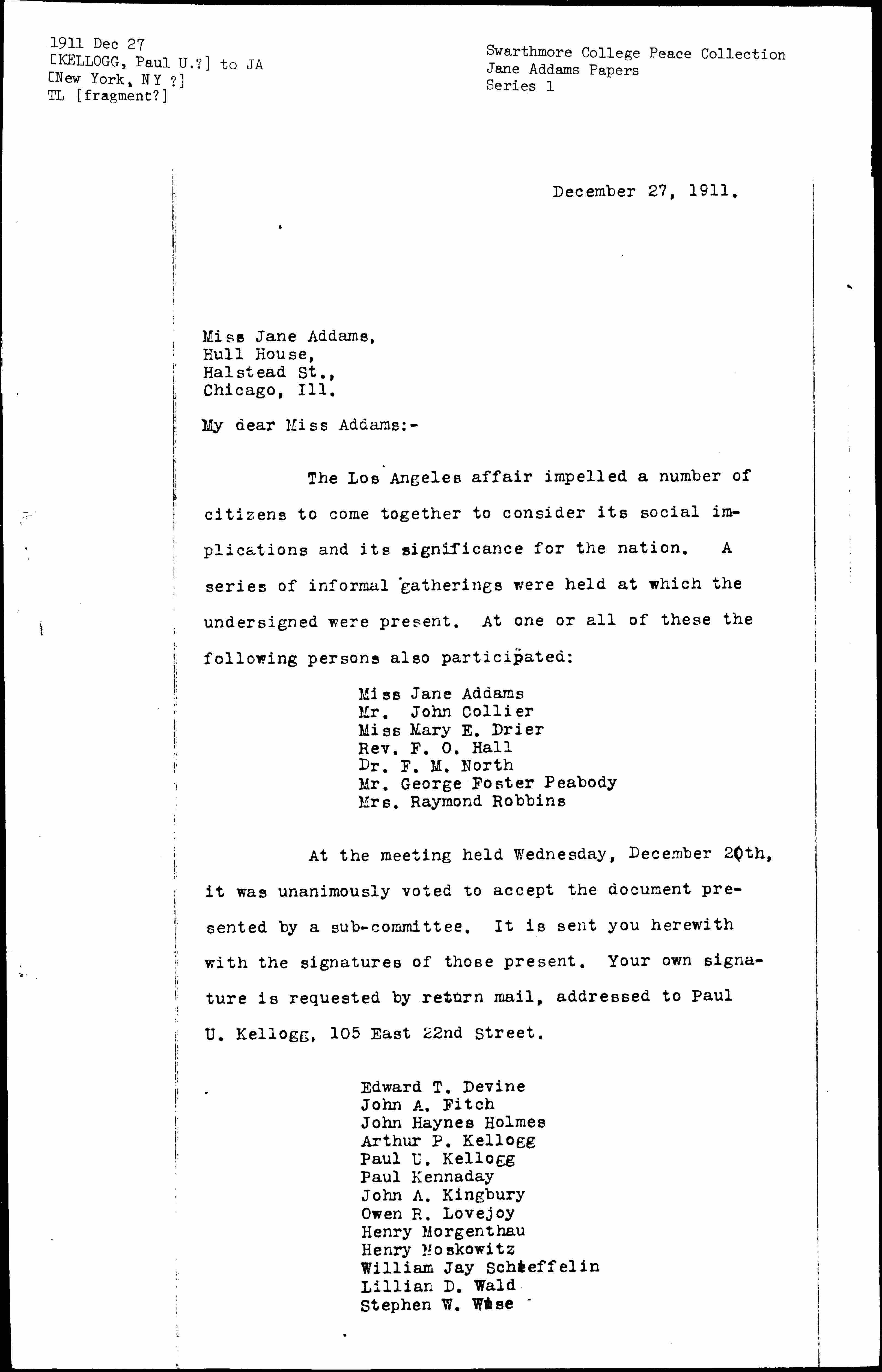 At the meeting held Wednesday, December 20th, it was unanimously voted to accept the document presented by a sub-committee. It is sent you herewith with the signatures of those present. Your own signature is requested by return mail, addressed to Paul U. Kellogg, 105 East 22nd Street.