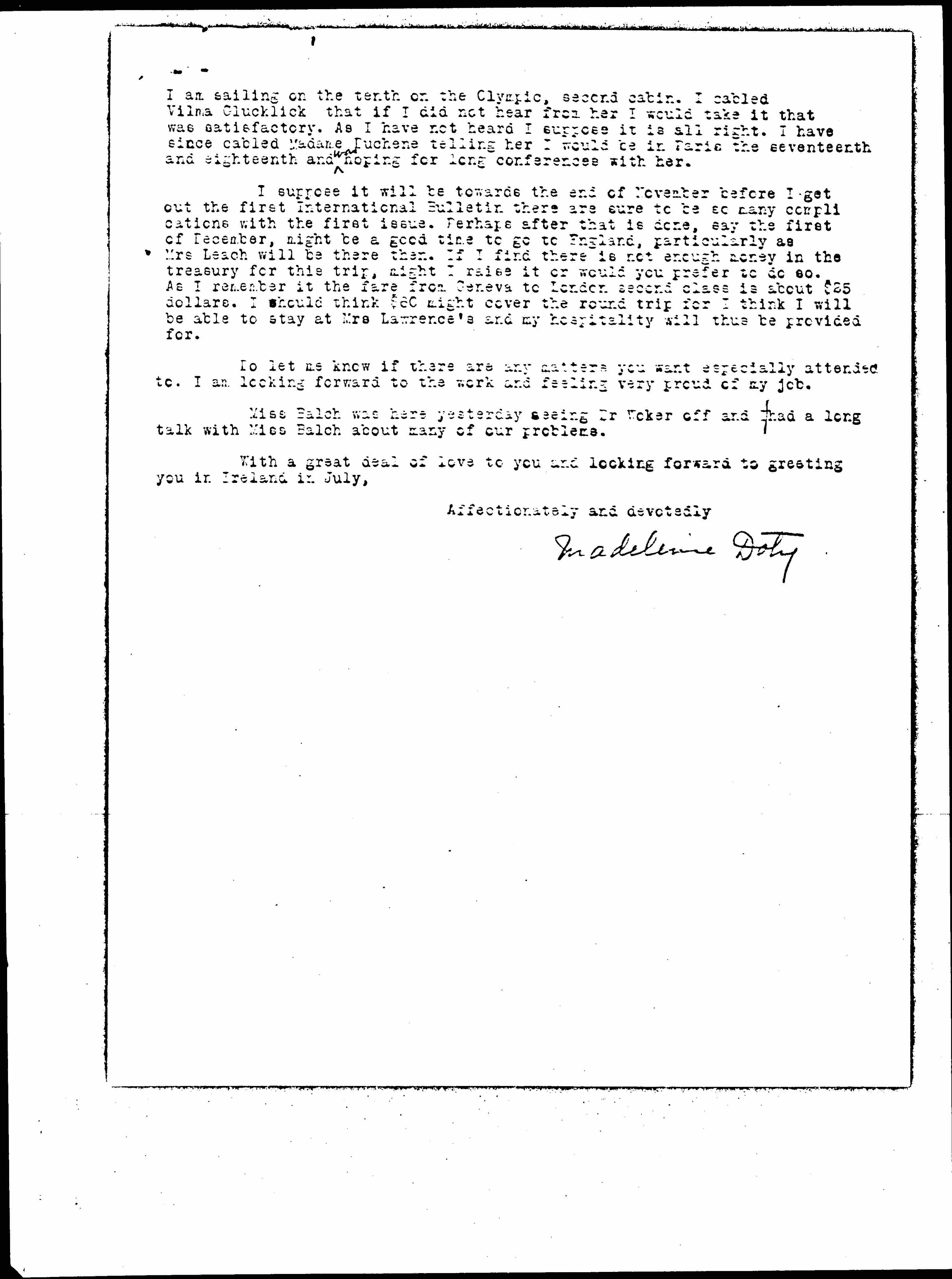 I am sailing on the tenth on the Olympic, second cabin. I cabled Vilma Glücklich that if I did not hear from her I would take it that was satisfactory. As I have not heard I suppose it is all right. I have since cabled Madame Duchêne telling her I would be in Paris the seventeenth and eighteenth and ↑was↓ hoping for long conferences with her.
