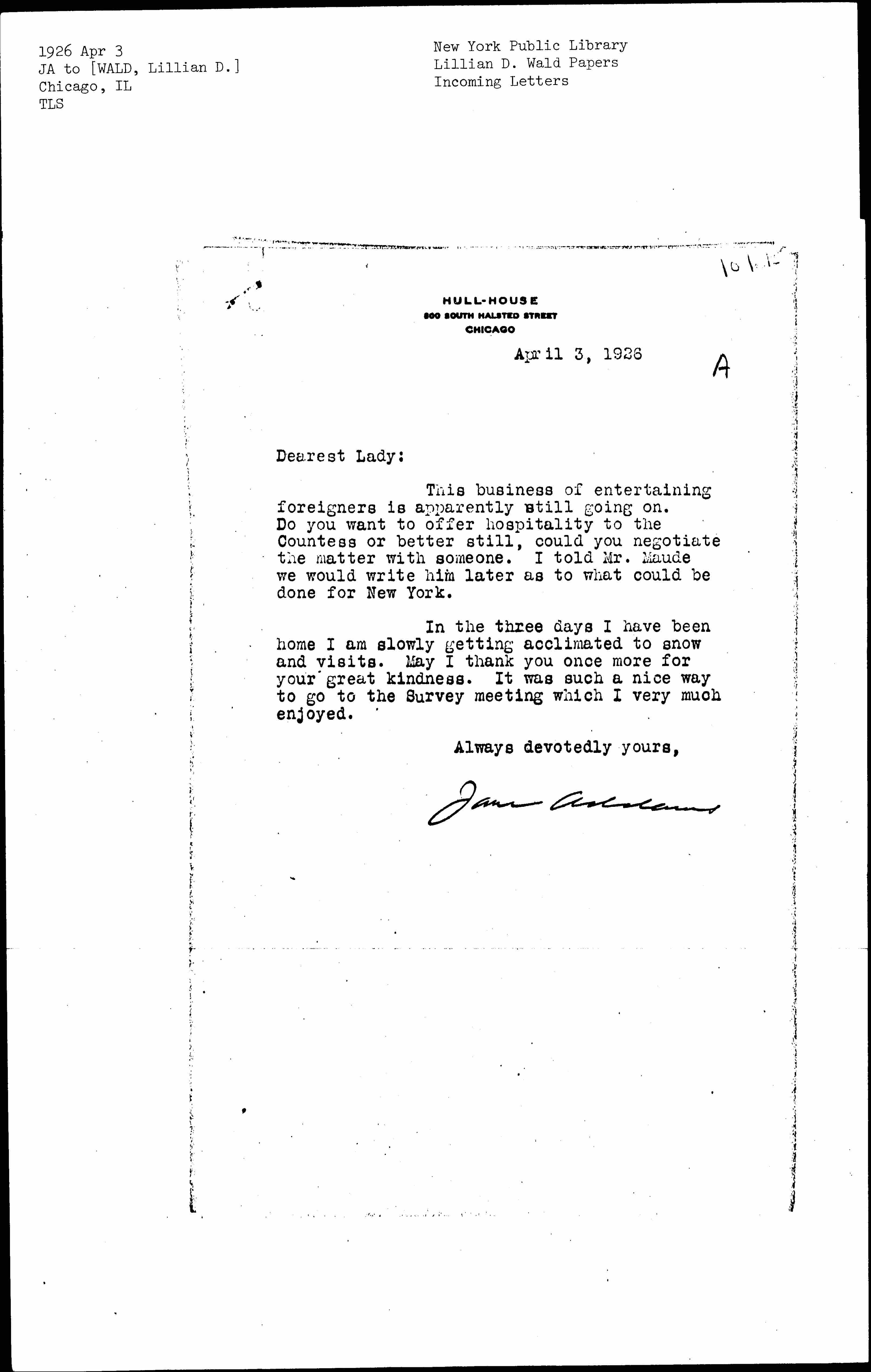 This business of entertaining foreigners is apparently still going on. Do you want to offer hospitality to the Countess or better still, could you negotiate the matter with someone. I told Mr. Maude we would write him later as to what could be done for New York.