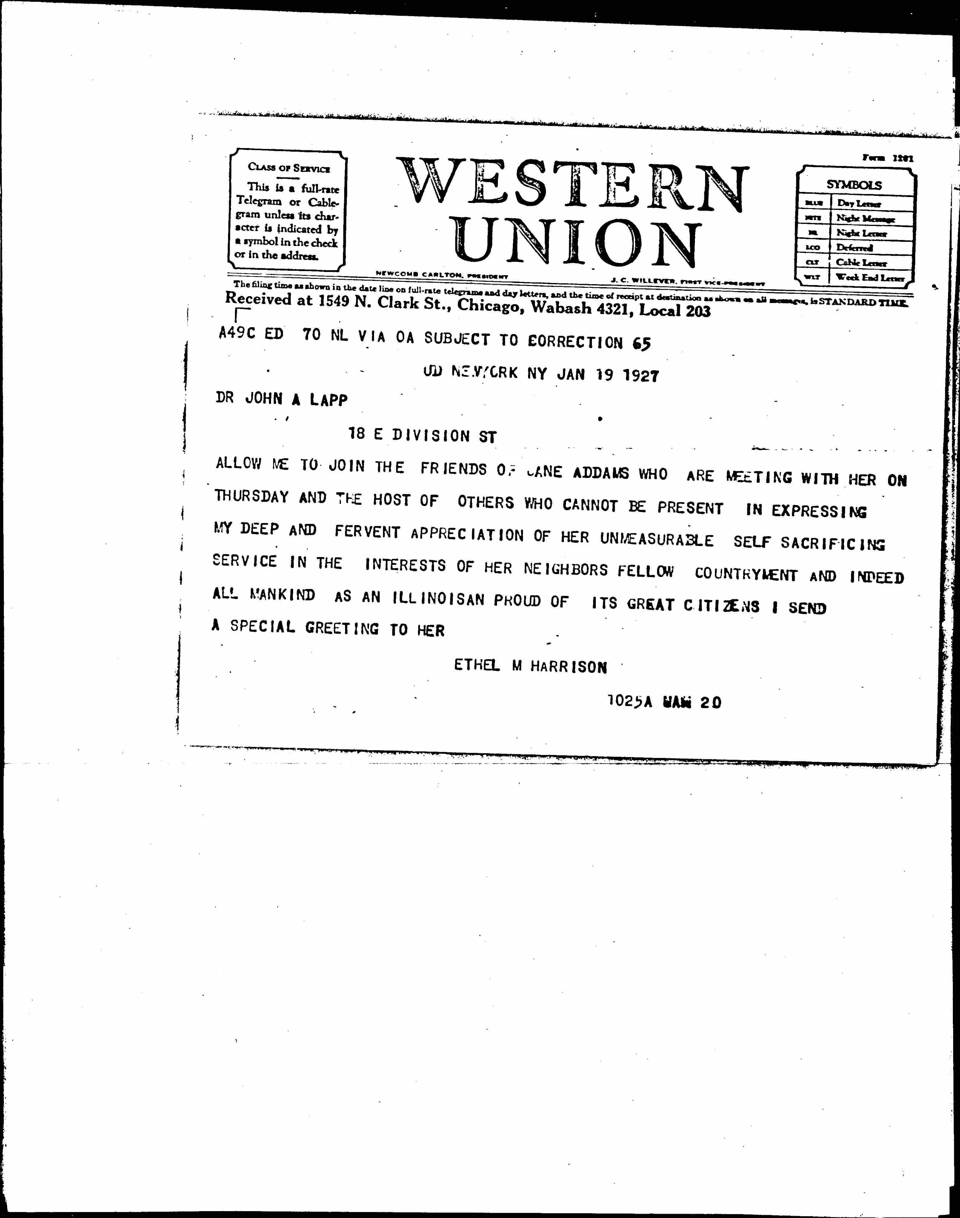 ALLOW ME TO JOIN THE FRIENDS OF JANE ADDAMS WHO ARE MEETING WITH HER ON THURSDAY AND THE HOST OF OTHERS WHO CANNOT BE PRESENT IN EXPRESSING MY DEEP AND FERVENT APPRECIATION OF HER UNMEASURABLE SELF SACRIFICING SERVICE IN THE INTERESTS OF HER NEIGHBORS FELLOW COUNTRYMEN AND INDEED ALL MANKIND AS AN ILLINOISAN PROUD OF ITS GREAT CITIZENS I SEND A SPECIAL GREETING TO HER