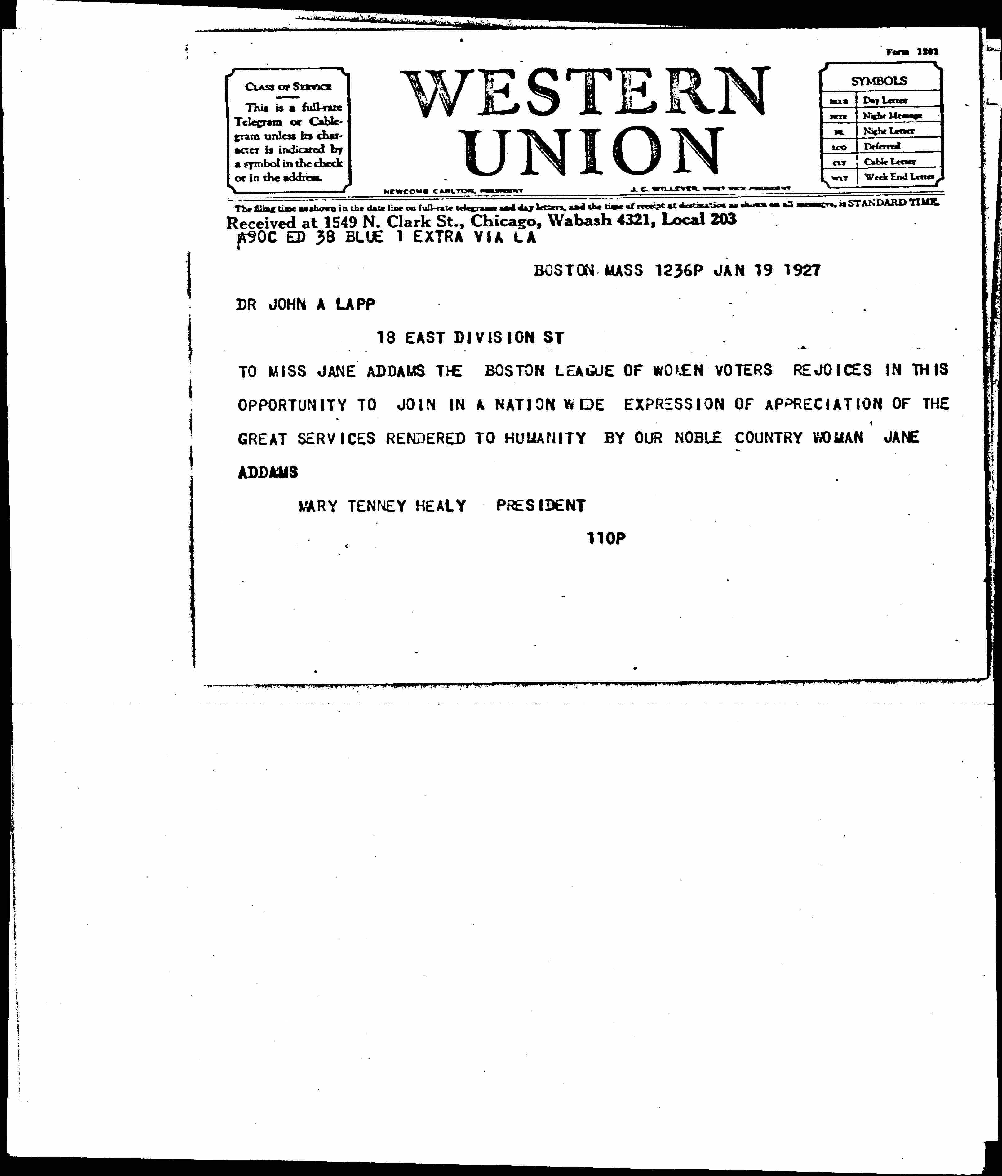 TO MISS JANE ADDAMS THE BOSTON LEAGUE OF WOMEN VOTERS REJOICES IN THIS OPPORTUNITY TO JOIN IN A NATION WIDE EXPRESSION OF APPRECIATION OF THE GREAT SERVICES RENDERED TO HUMANITY BY OUR NOBLE COUNTRY WOMEN JANE ADDAMS