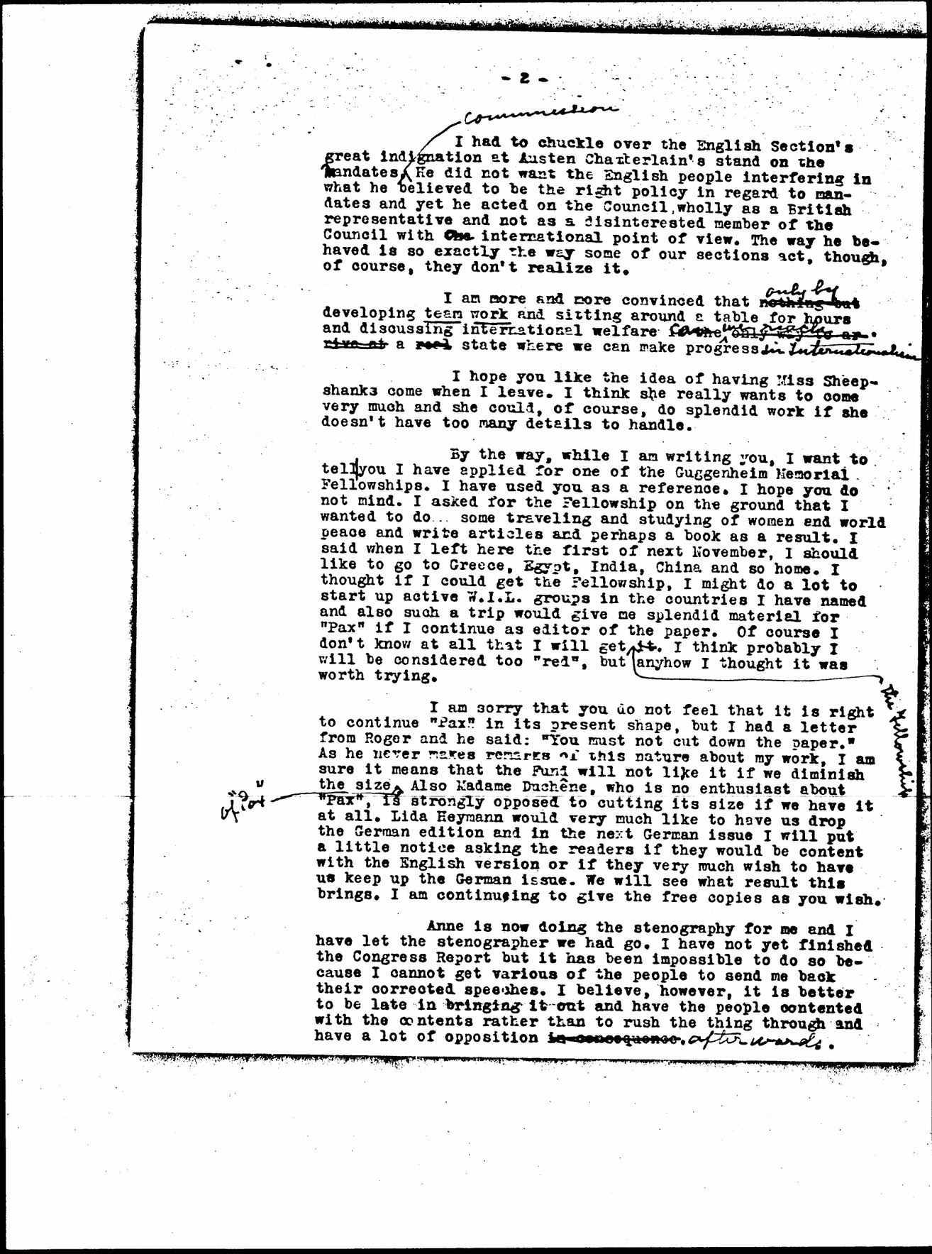 By the way, while I am writing you, I want to tell you I have applied for one of the Guggenheim Memorial Fellowships. I have used you as a reference. I hope you do not mind. I asked for the Fellowship on the ground that I wanted to do some traveling and studying of women and world peace and write articles and perhaps a book as a result. I said when I left here the first of next November, I should like to go to Greece, Egypt, India, China and [go] home. I thought if I could get the Fellowship, I might do a lot to start up active W.I.L. groups in the countries I have named and also such a trip would give me splendid material for "Pax" if I continue as editor of the paper. Of course I don't know at all that I will get ↑the fellowship↓ it. I think probably I will be considered too "red," but anyhow I thought it was worth trying.