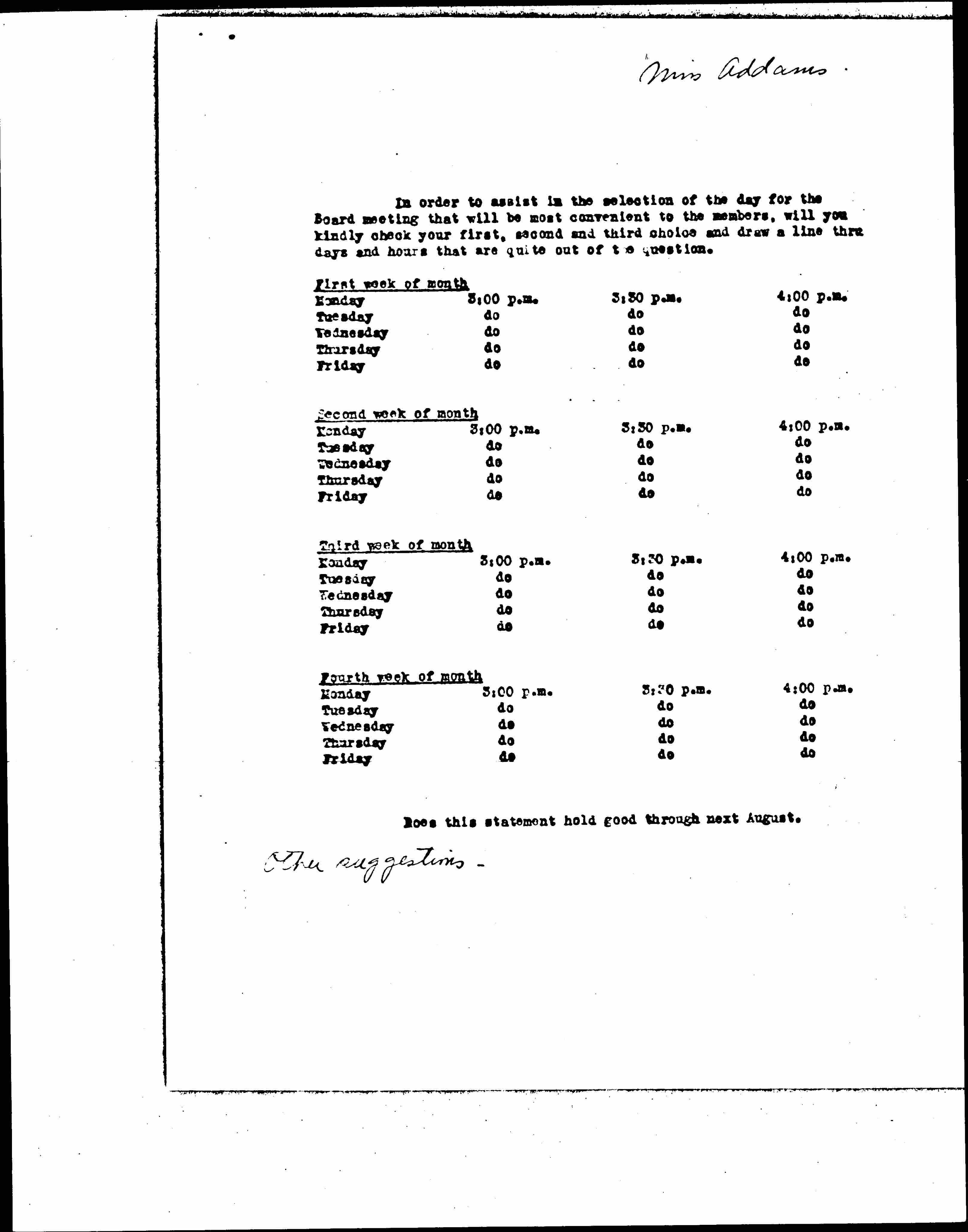 In order to assist in the selection of the day for the Board meeting that will be most convenient to the members, will you kindly check your first, second and third choice and draw a line three days and hours that are quite out of the question.