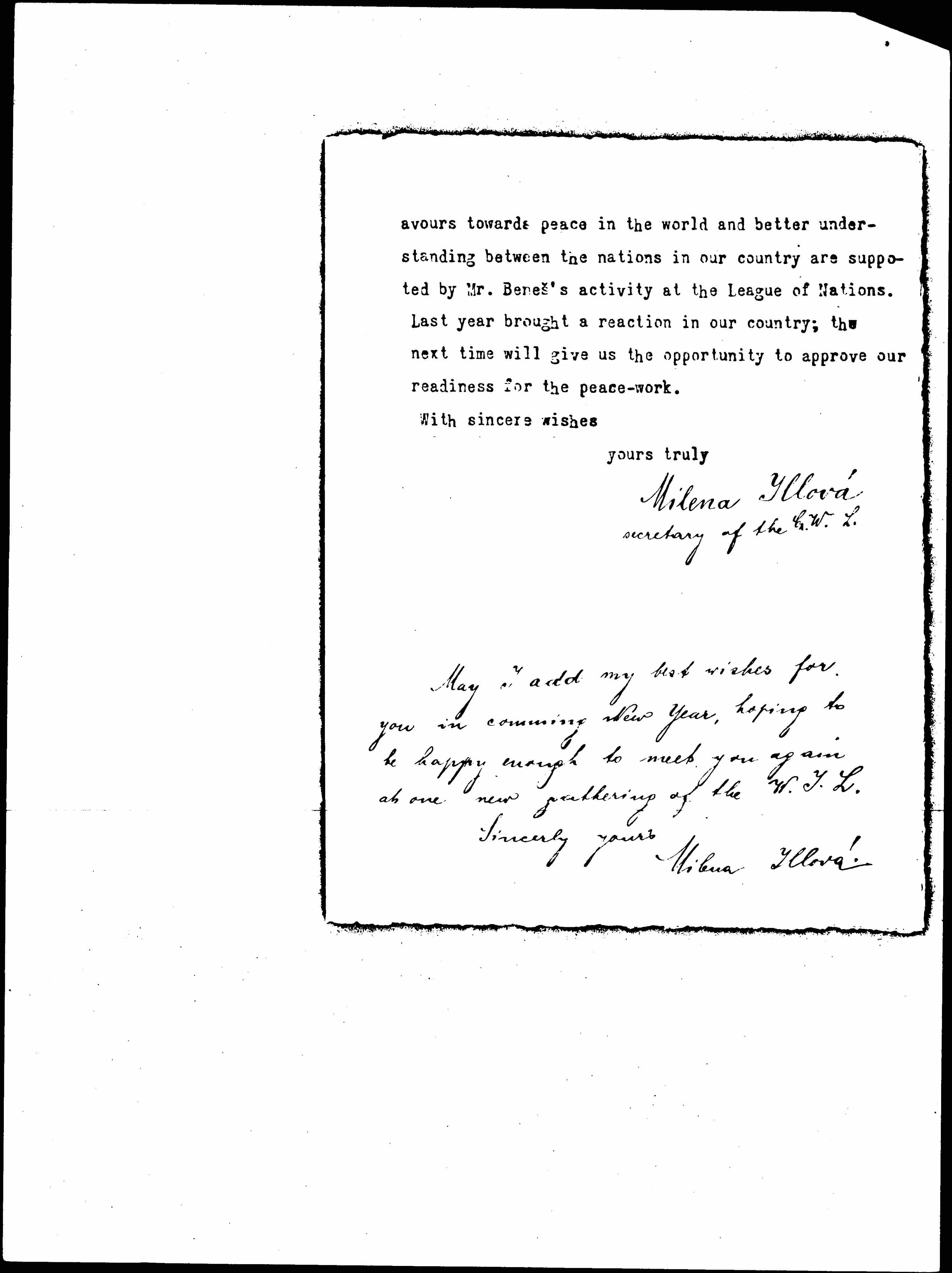 We try to run our peace-work seriously, we had a great help in Mr. Masaryk's personality and our [endeavors] [page 2] towards peace in the world and better understanding between the nations in our country are [supported] by Mr. Beneš's activity at the League of Nations. Last year brought a reaction in our country; the next time will give us the opportunity to approve our readiness for the peace-work.