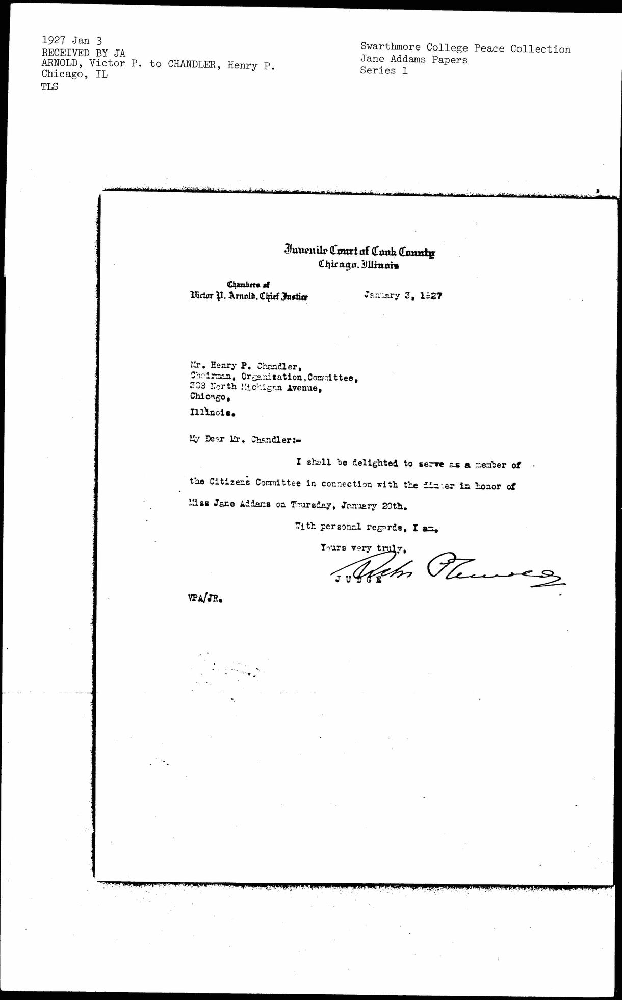 I shall be delighted to serve as a member of the Citizens Committee in connection with the dinner in honor of Miss Jane Addams on Thursday, January 20th.
