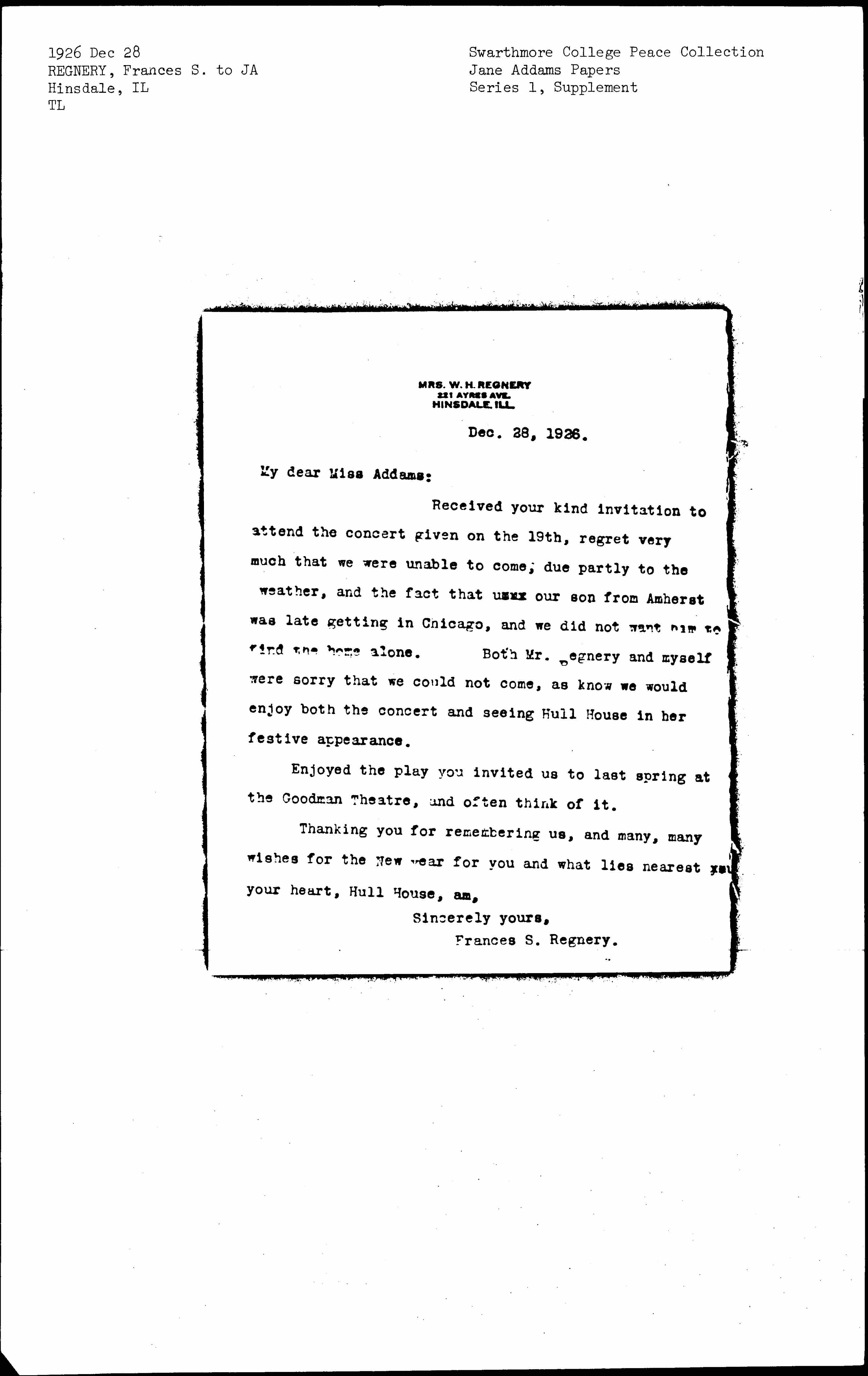 Received your kind invitation to attend the concert given on the 19th, regret very much that we were unable to come; due partly to the weather, and the fact that [illegible] our son from Amherst was late getting in Chicago, and we did not want him to find the home alone. Both Mr. Regnery and myself were sorry that we could not come, as know we would enjoy both the concert and seeing Hull House in her festive appearance.