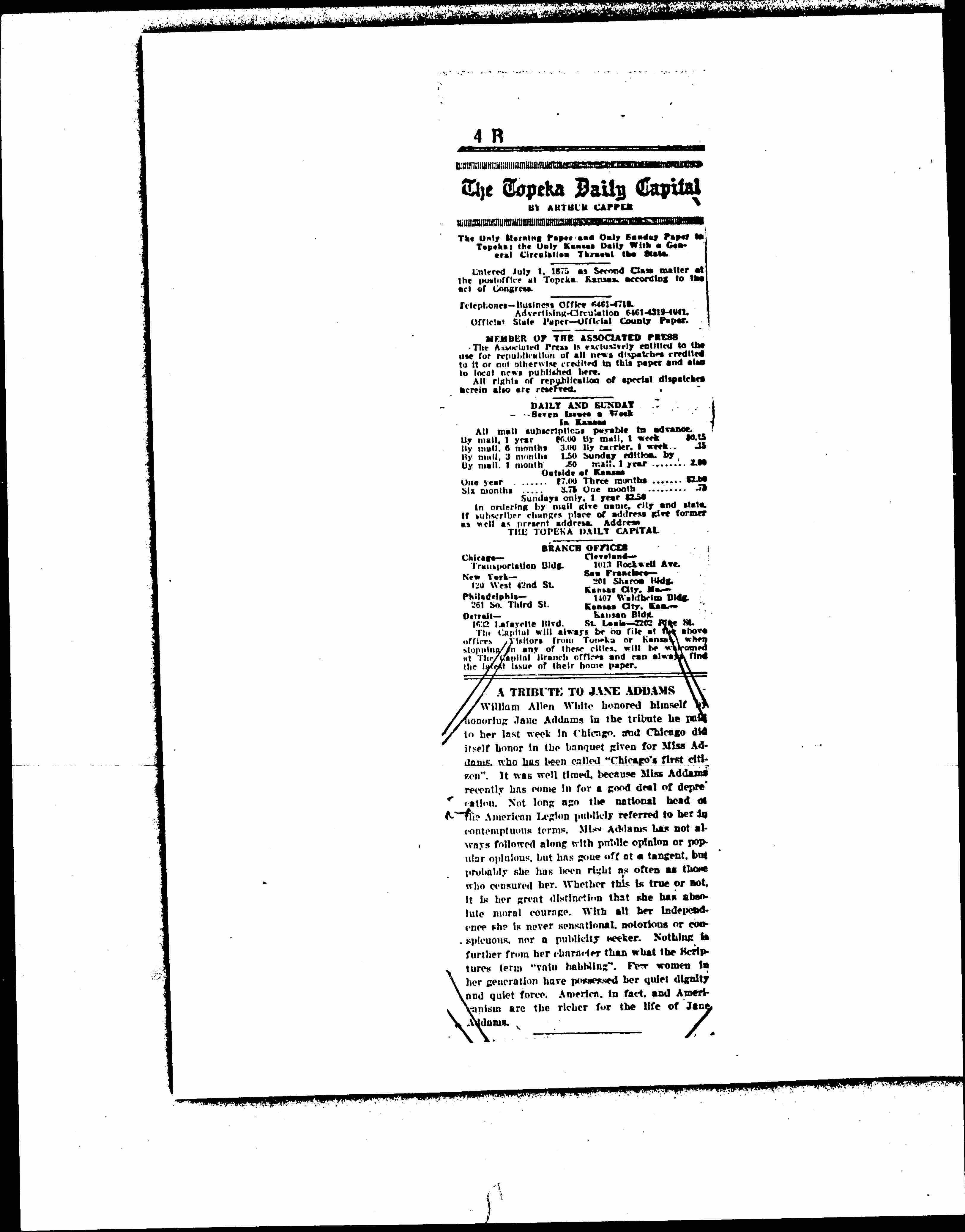 William Allen White honored himself by honoring Jane Addams in the tribute he paid to her last week in Chicago, and Chicago did itself honor in the banquet given for Miss Addams, who has been called "Chicago's first citizen." It was well timed, because Miss Addams recently has come in for a good deal of deprecation. Not long ago the national head of the American Legion publicly referred to her in contemptuous terms. Miss Addams has not always followed along with public opinion or popular opinions, but has gone off at a tangent, but probably she has been right as often as those who censured her. Whether this is true or not, it is her great distinction that she has absolute moral courage. With all her independence she is never sensational, notorious or conspicuous nor a publicity seeker. Nothing is further from her character than what the Scriptures term "vain babbling." For women in her generation have possessed her quiet dignity and quiet force. America, in fact, and Americanism are the richer for the life of Jane Addams.