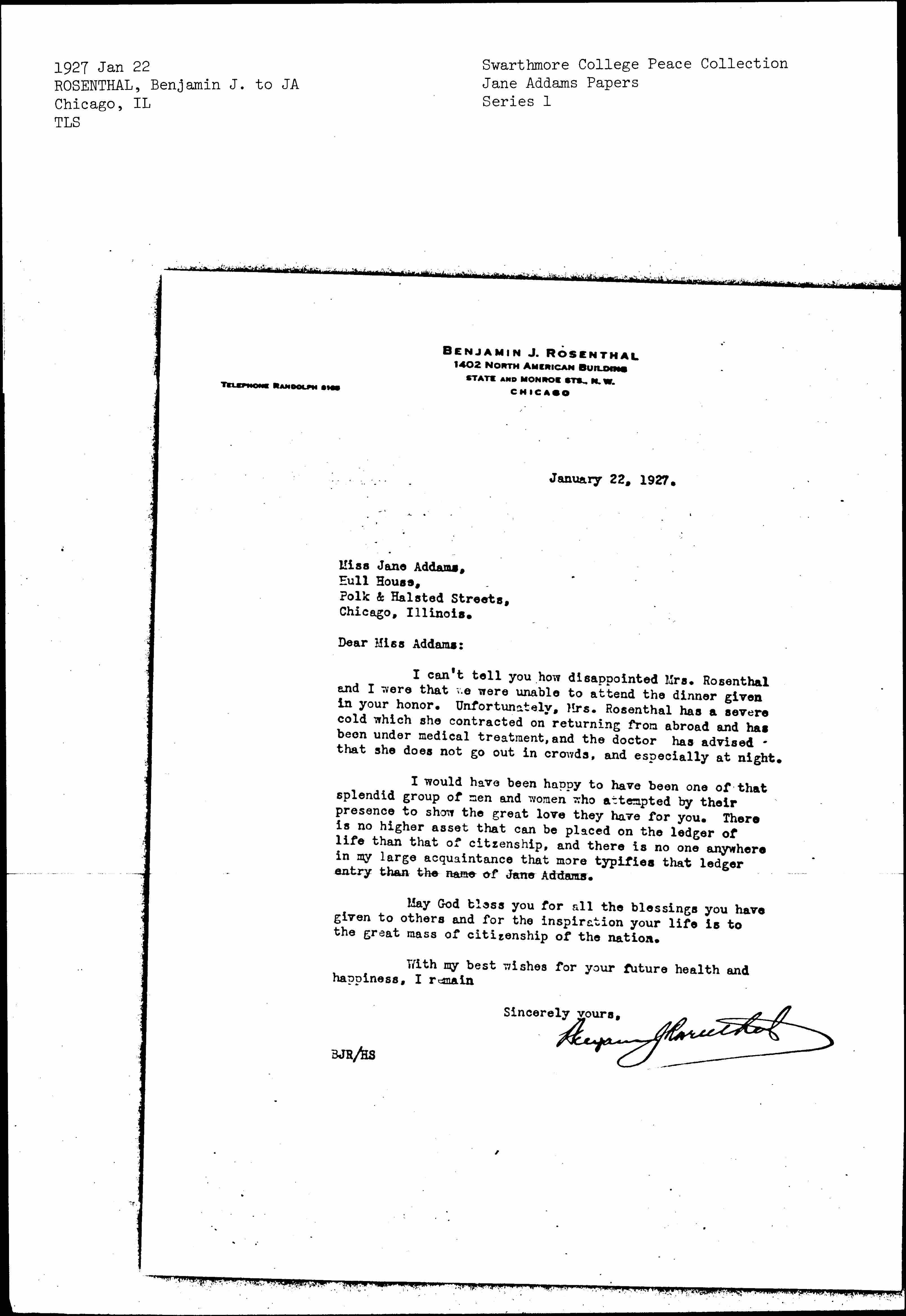 I would have been happy to have been one of that splendid group of men and women who attempted by their presence to show the great love they have for you. There is no higher asset that can be placed on the ledger of life than that of citizenship, and there is no one anywhere in my large acquaintance that more typifies that ledger entry than the name of Jane Addams.
