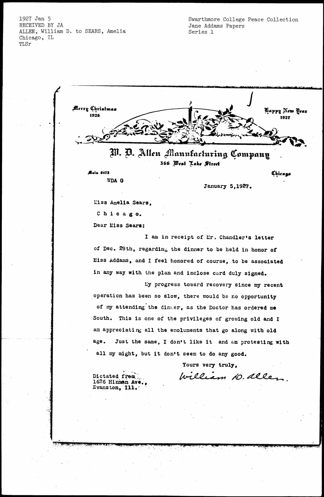 I am in receipt of Mr. Chandler's letter of Dec. 29th, regarding the dinner to be held in honor of Miss Addams, and I feel honored of course, to be associated in any way with the plan and [enclose] card duly signed.