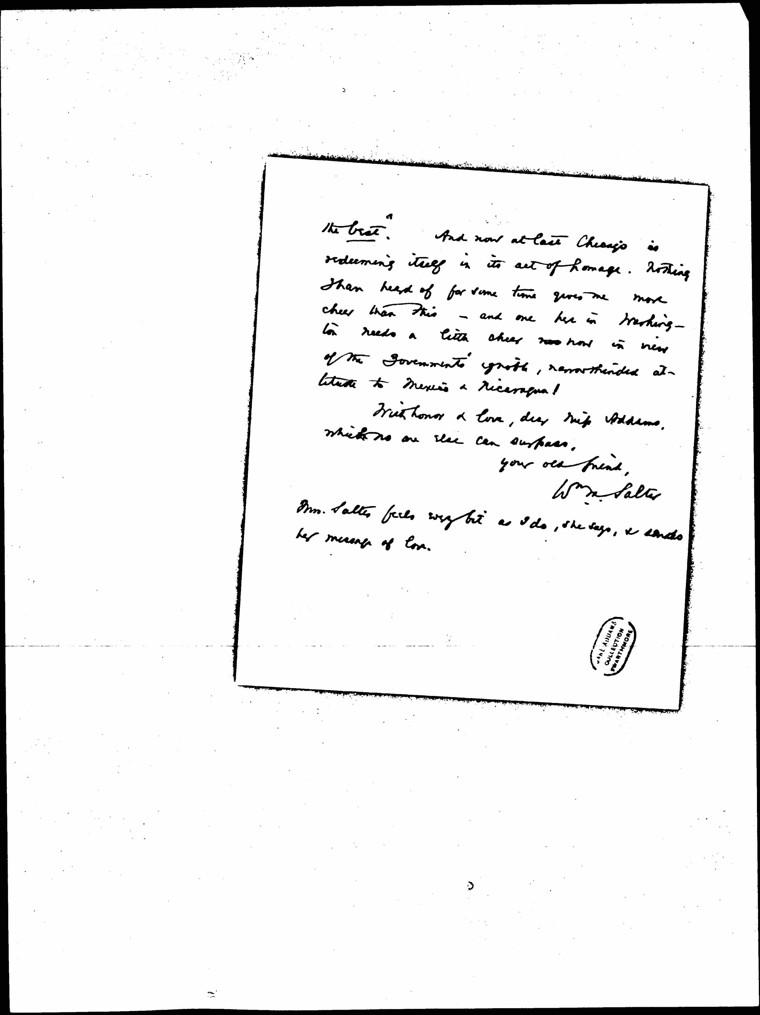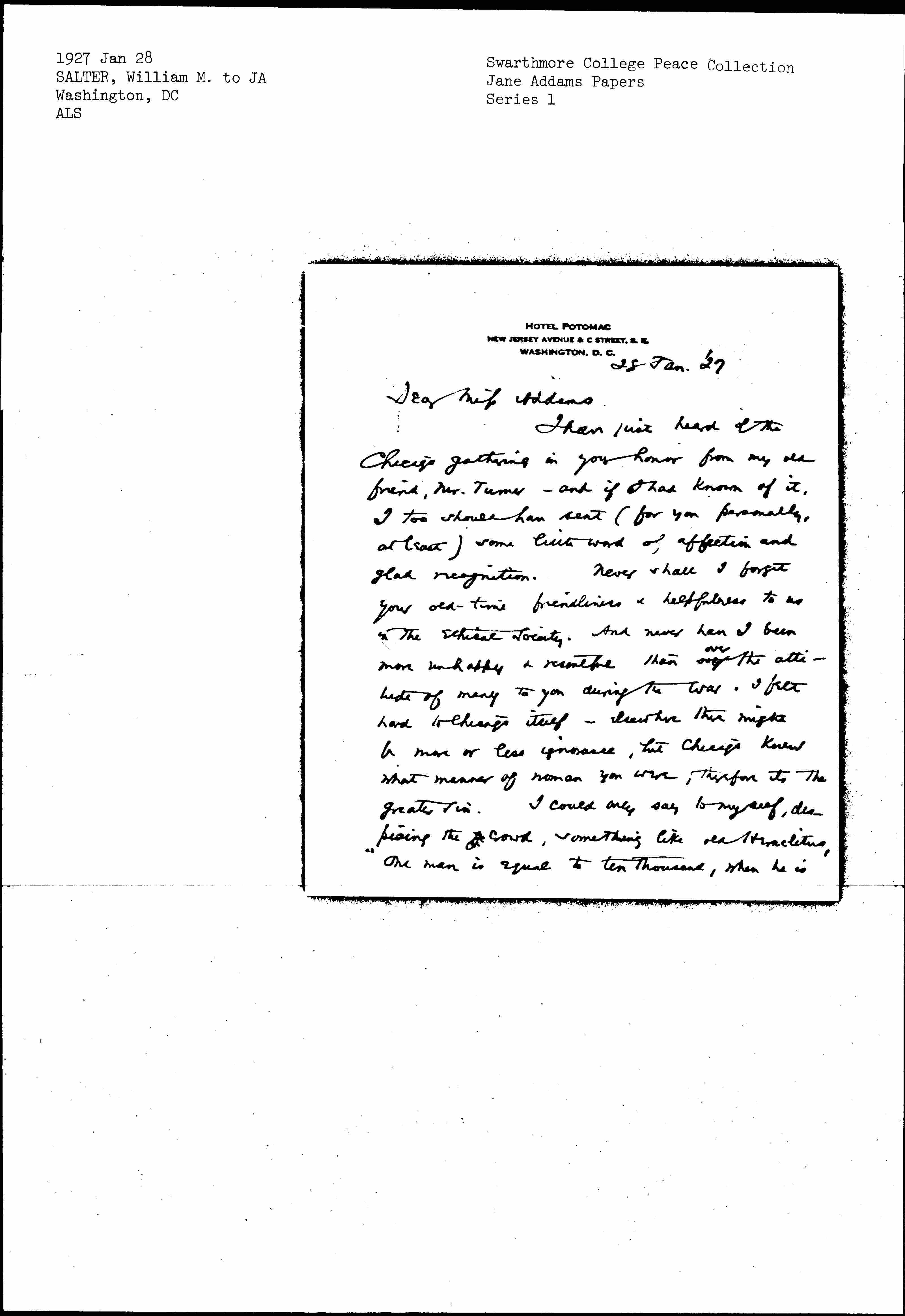 I have just heard of the Chicago gathering in your honor from my old friend, Mr. Turner -- and if I had known of it, I too should have sent (for you personally, at least) some little word of affection and glad recognition. Never shall I forget your old-time friendliness & helpfulness to us in The Ethical Society. And never have I been more unhappy & resentful than [illegible] ↑over↓ the attitude of many to you during the war. I felt hard to Chicago itself -- elsewhere there might be more or less ignorance, but Chicago knew what manner of woman you were, therefore [it's] the greater sin. I could only say to myself, despising the [illegible] crowd, something like old Heraclitus, "One man is equal to ten thousand, when he is [page 2] the best." And now at last Chicago is redeeming itself in its act of homage. Nothing I have heard of for some time gives me more cheer than this -- and one here in Washington needs a little cheer [illegible] now in view of the government's ignoble, narrowminded attitude to Mexico & Nicaragua!