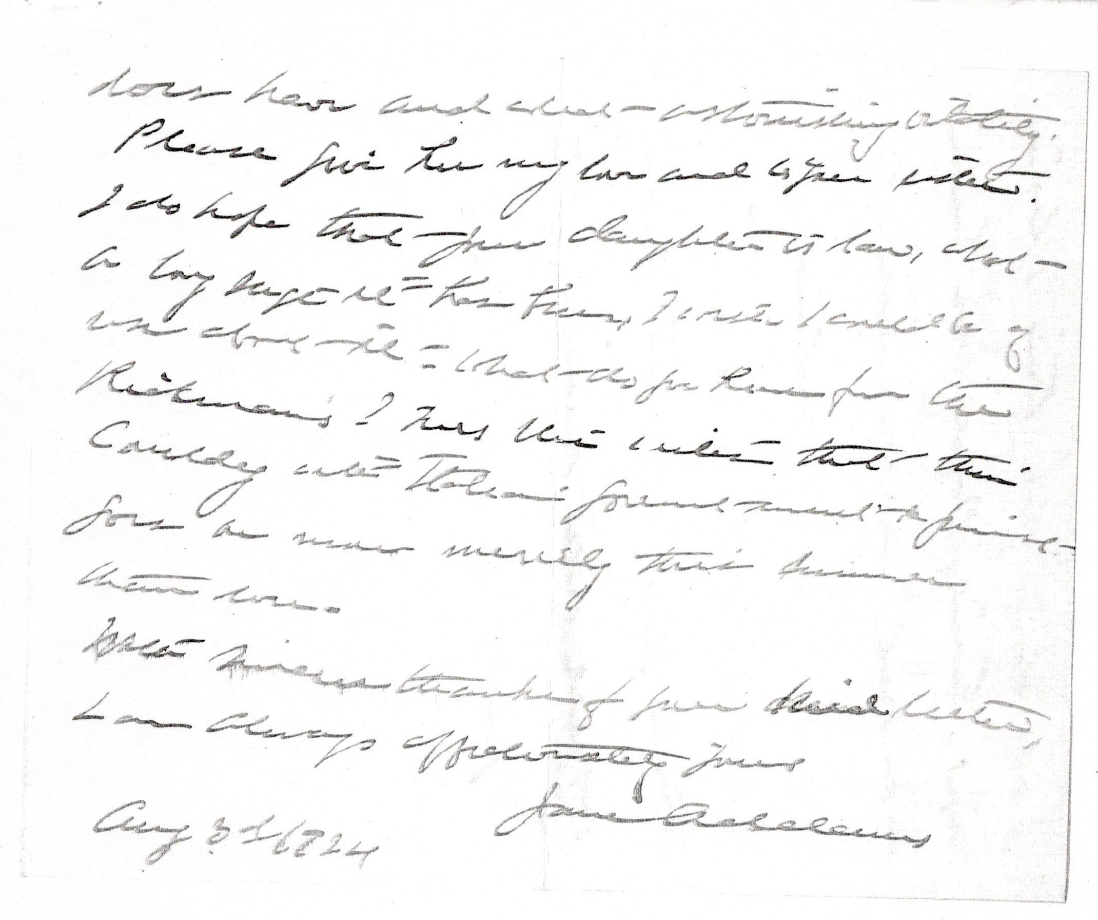 Please give her my love and to your sister. I do hope that your daughter in law, what a long [illegible] it has been, I wish I could be of [illegible] about it. What do you hear from the Rickmans? Mrs Urie writes that their [Couldy?] with the Italian government [& priest] goes on more merrily this summer than ever.
