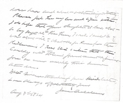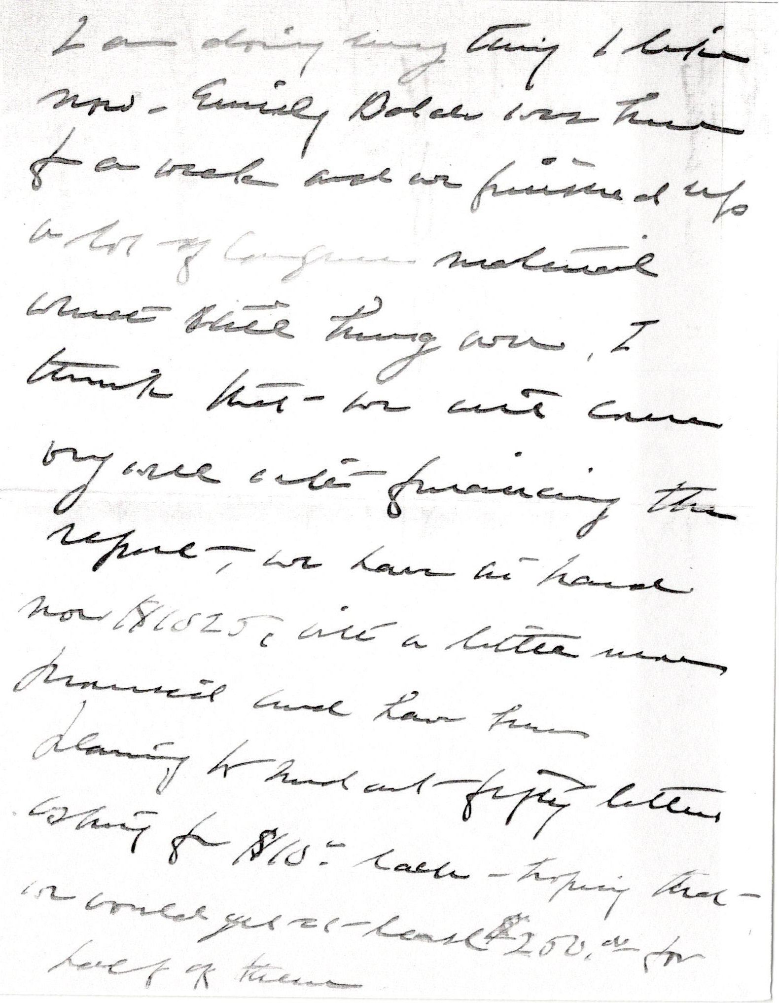 I am doing everything I like now. Emily Balch was here for a week and we finished up a lot of Congress material which still hung over. I think that we will come very well with financing the report, we have in hand now $1825, with a little more promised and have been planning to send out fifty letters asking for $10.00 each -- hoping that we could get at least $250.00 for half of them. [page 3] We must try not to push into the list who would naturally give to the national, but we are now so near to the end that I am much encouraged. We made out the accounts and it is astounding is it that we are out of debt. I am sending on Mde Ramondt's letter, to show that the Europeans were really very appreciative. I should be glad to have it returned some time.