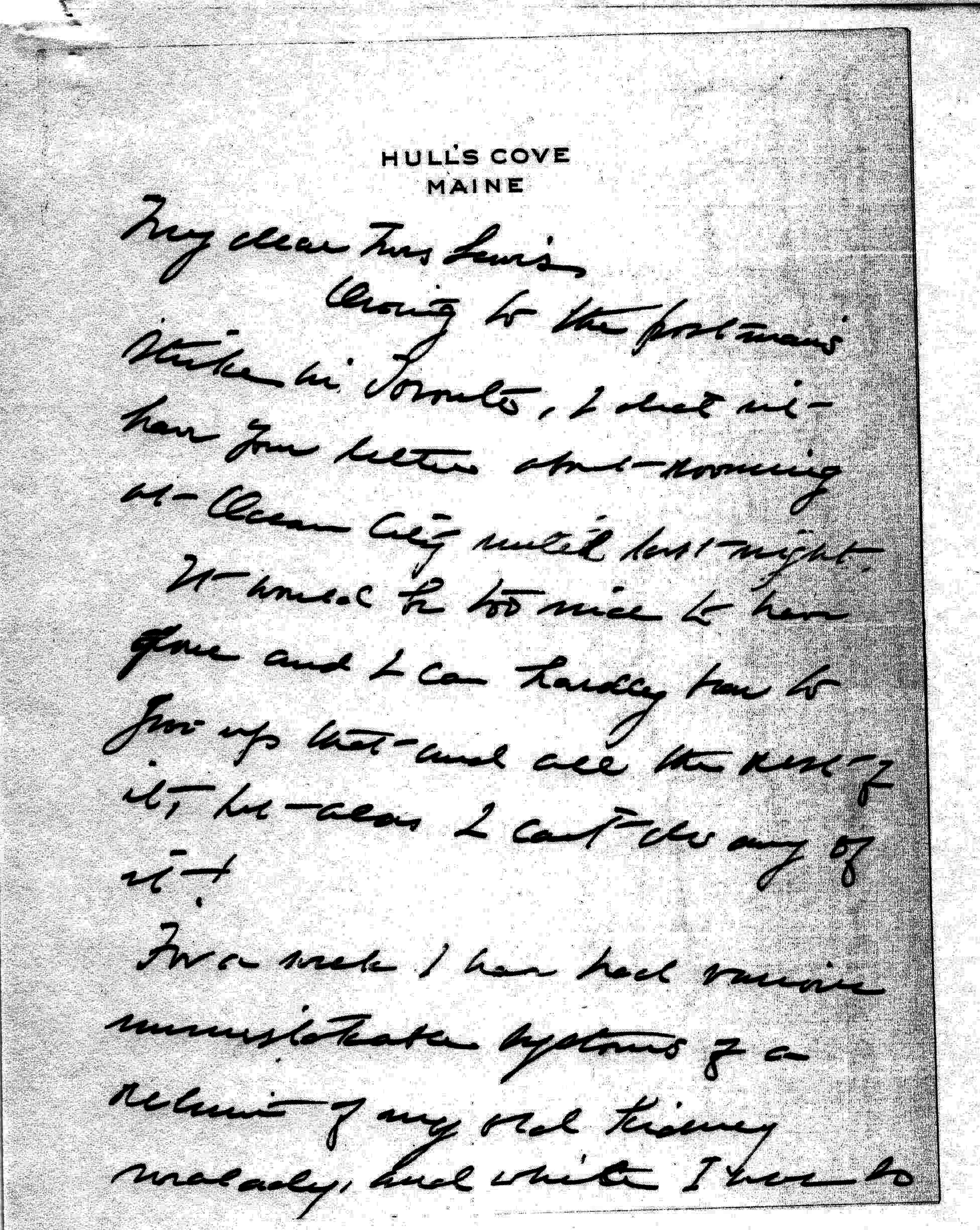 P.S. Your telegram came before this letter was posted and only an hour after my telegrams had been sent. I am better this morning and on my feet but I am really convinced that it would be foolish for me to travel and that I would probably end up going to bed at The Flanders and be of no use after I got there!
