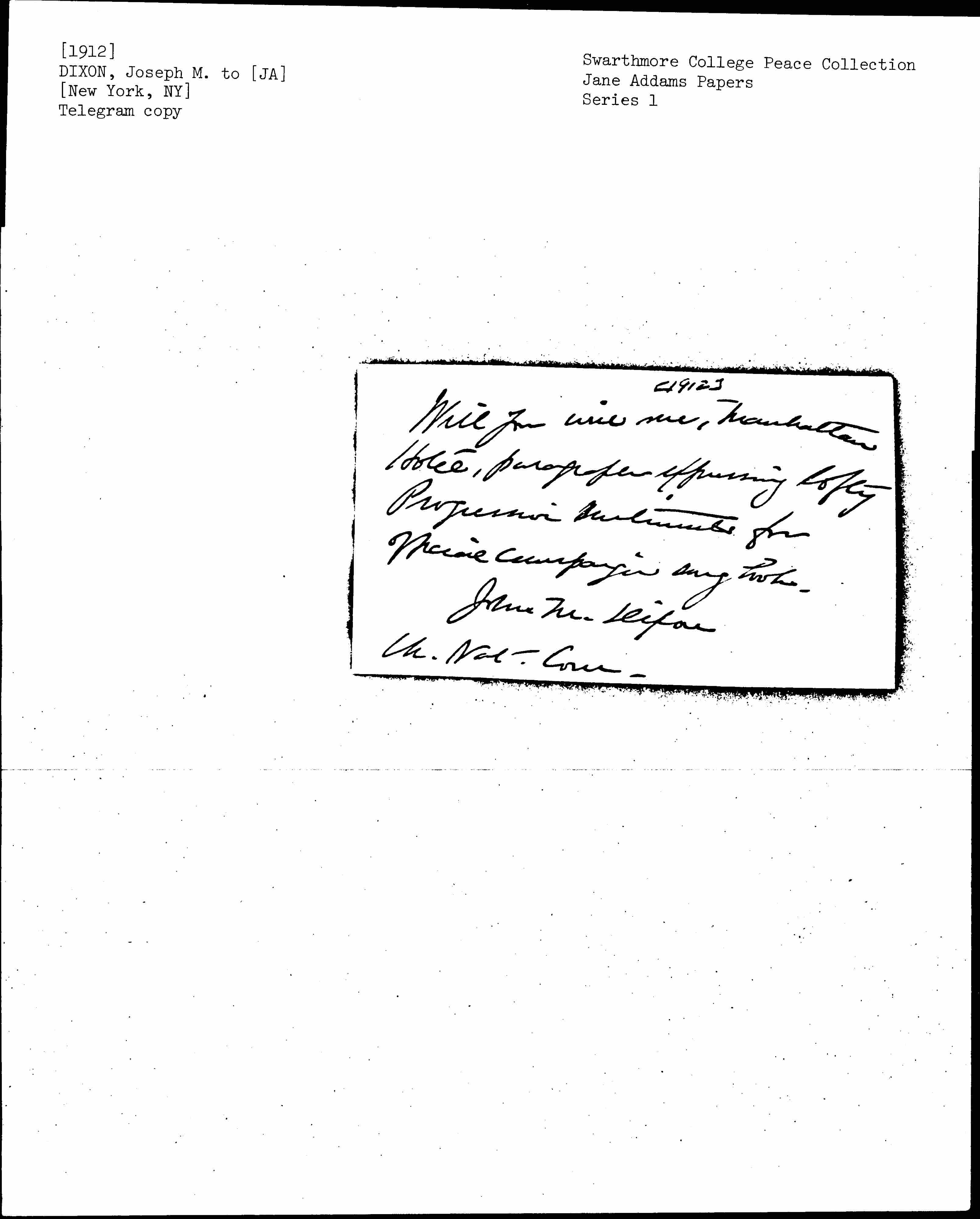 Will you visit me, Manhattan Hotel, paragraph expressing lofty Progressive sentiments for official campaign song book.