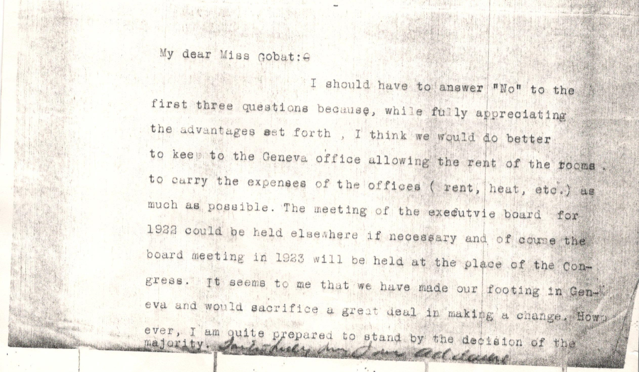 I should have to answer "No" to the first three questions because, while fully appreciating the advantages set forth, I think we would do better to keep the Geneva office allowing the rent of the rooms to carry the expenses of the offices (rent, heat, etc.) as much as possible. The meeting of the executive board for 1922 could be held elsewhere if necessary and of course the board meeting in 1923 will be held at the place of the Congress. It seems to me that we have made our footing in Geneva and would sacrifice a great deal in making a change. However, I am quite prepared to stand by the decision of the majority. ↑Faithfully yours↓ Jane Addams [signed]