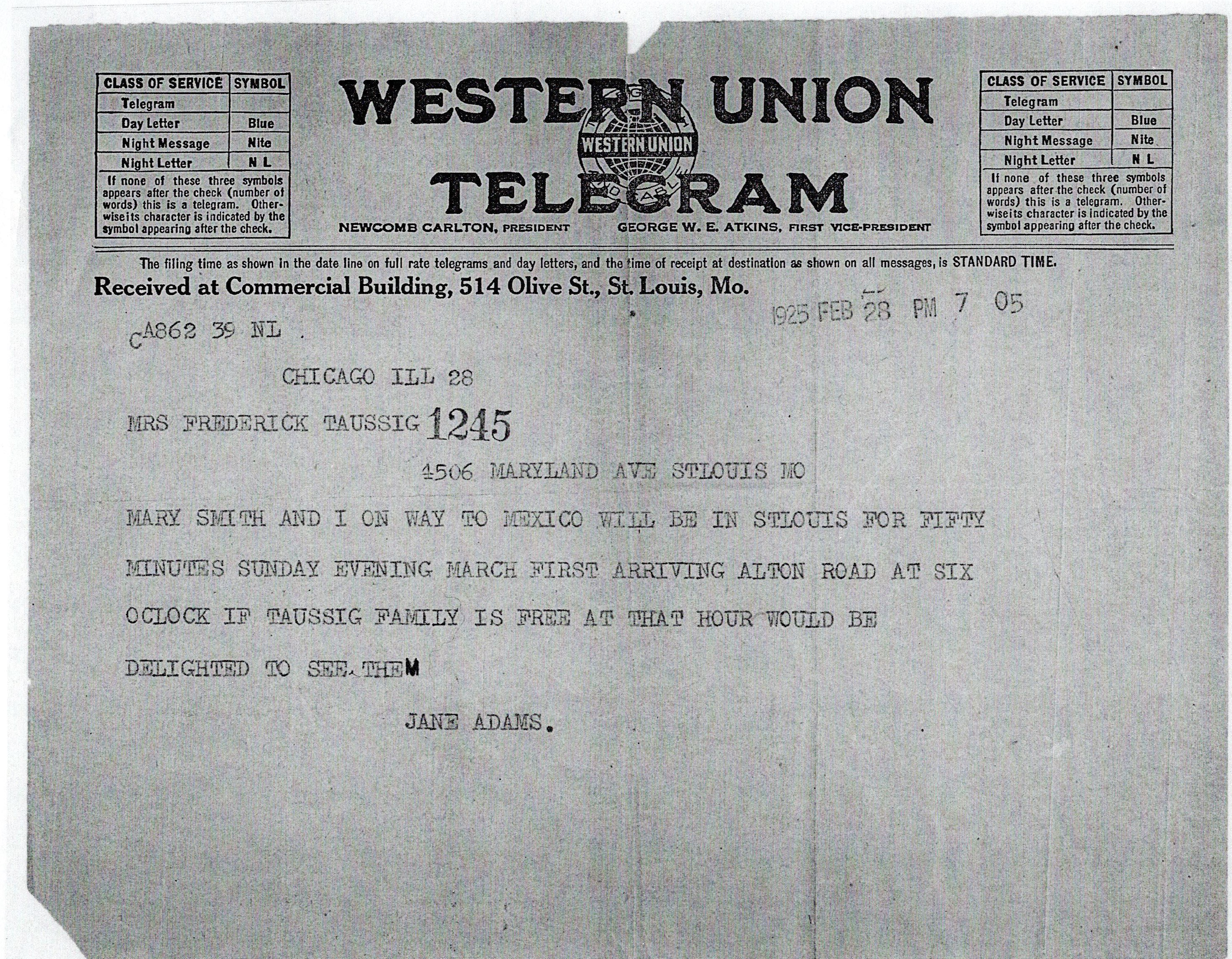 MARY SMITH AND I ON WAY TO MEXICO WILL BE IN ST LOUIS FOR FIFTY MINUTES SUNDAY EVENING MARCH FIRST ARRIVING ALTON ROAD AT SIX OCLOCK IF TAUSSIG FAMILY IS FREE AT THAT HOUR WOULD BE DELIGHTED TO SEE THEM