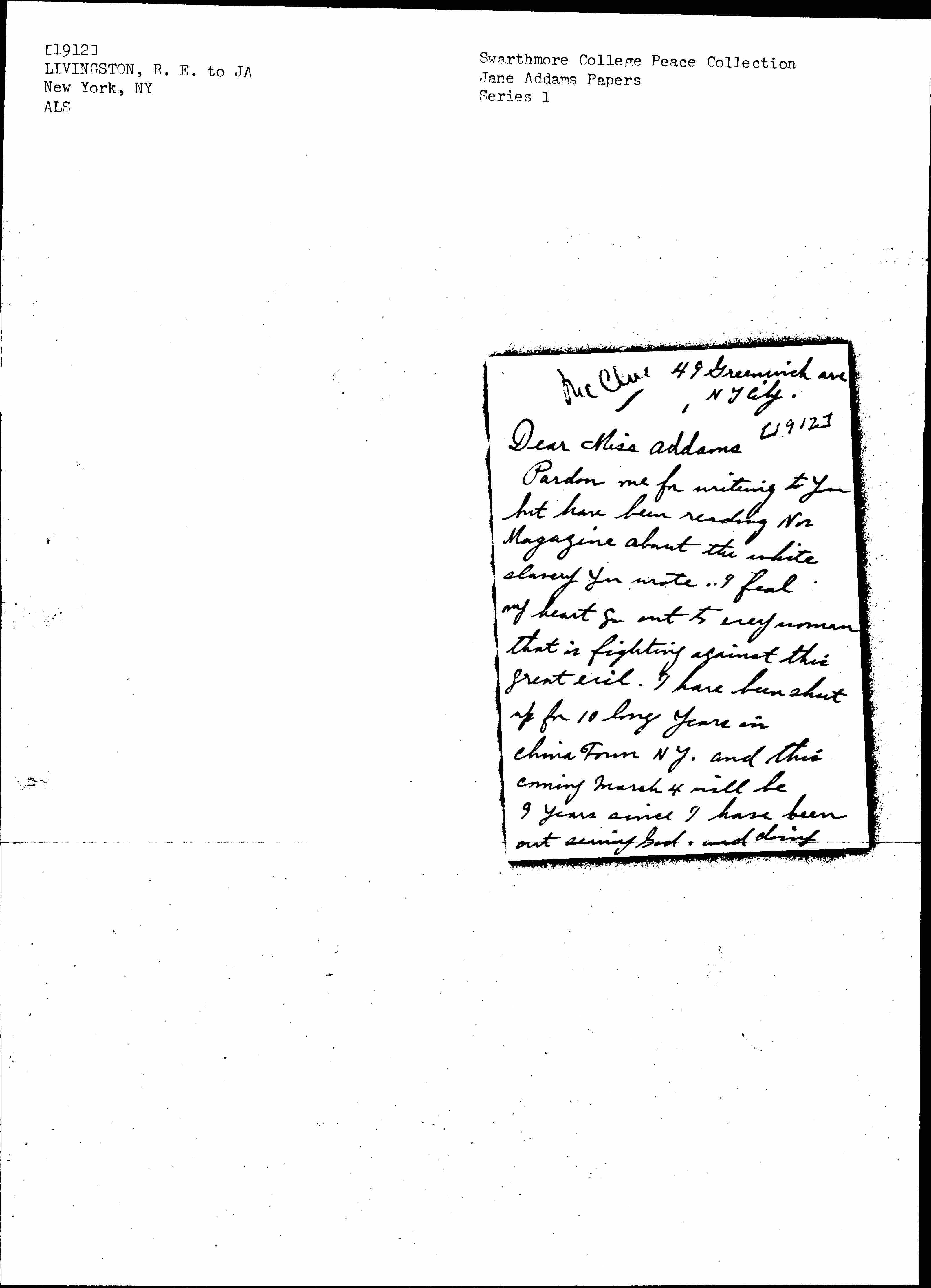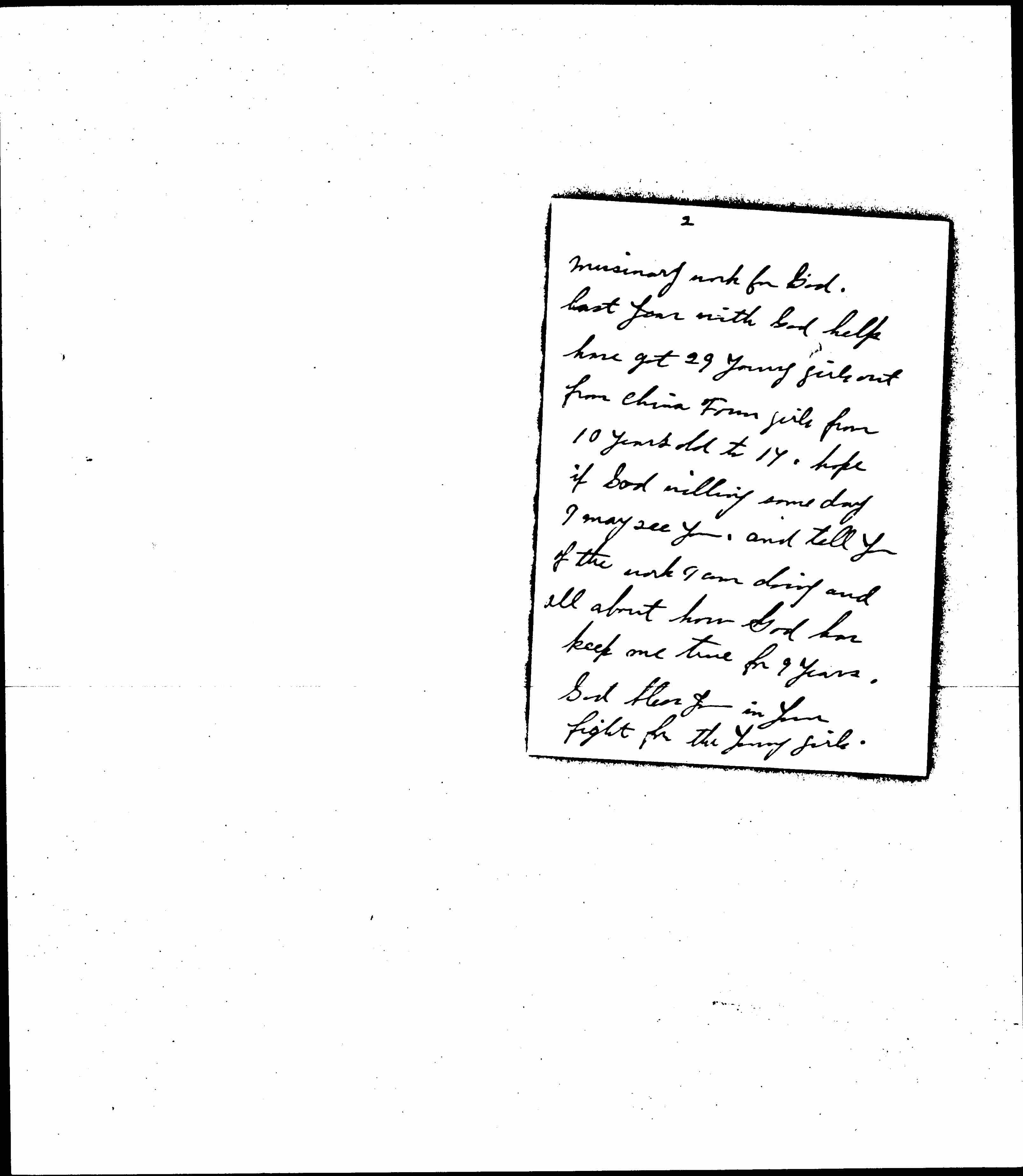 Pardon me for writing to you but have been reading Nov Magazine about the white slavery you wrote. I feel my heart go out to every woman that is fighting against this great evil. I have been shut up for 10 long years in China Town NY, and this coming March 4 will be 9 years since I have been out serving God, and doing [page 2] missionary work for God. last year with God help have got 29 young girls out from China Town girls from 10 years old to 17. hope if God willing someday I may see you, and tell you of the work I am doing and all about how God has keep me true for 9 years.