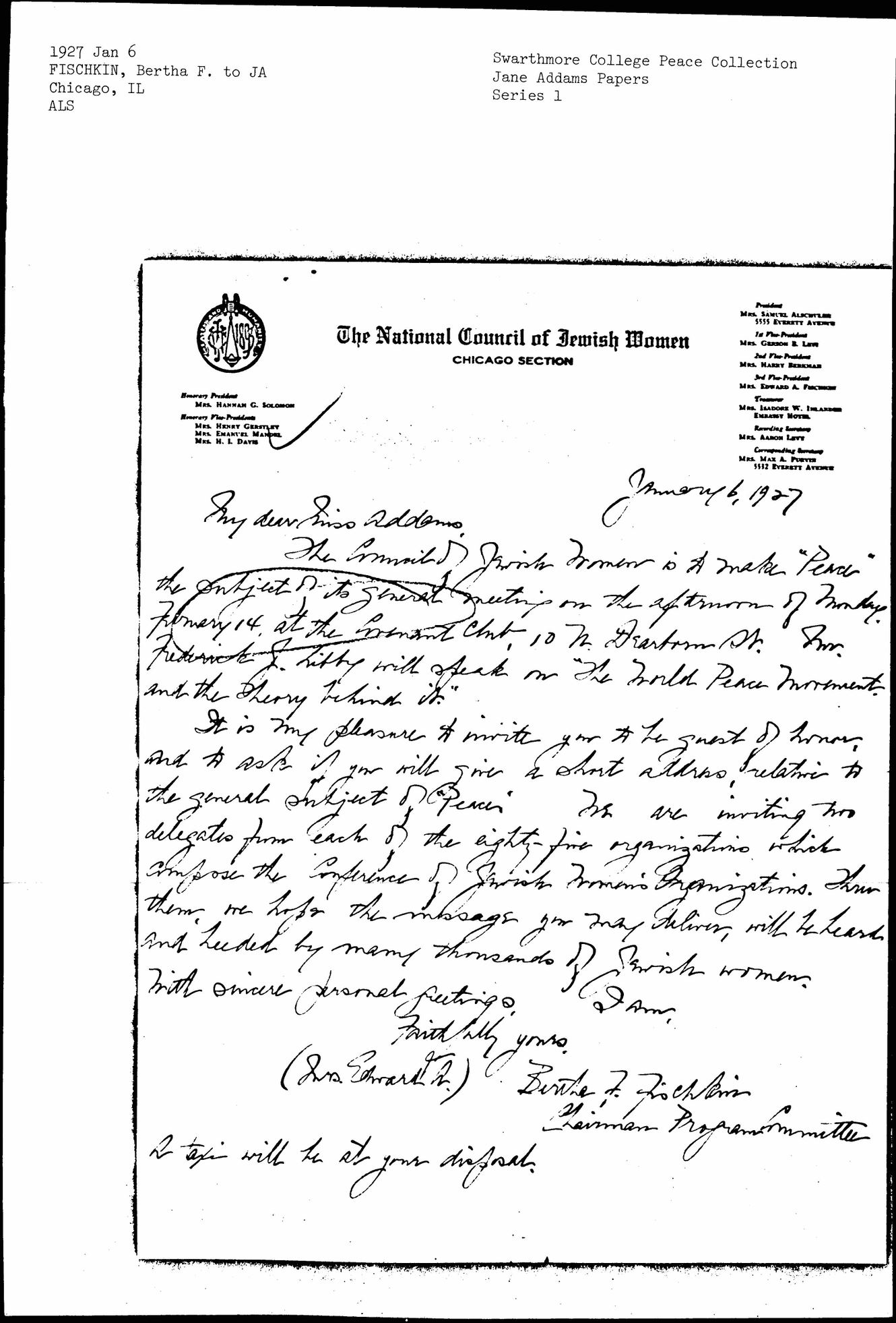 The Council of Jewish Women is to make "Peace" the subject of its general meeting on the afternoon of Monday February 14, at the Covenant Club, 10 N. Dearborn St. Mr. Frederick J. Libby will speak on "The World Peace Movement and the Theory behind it."