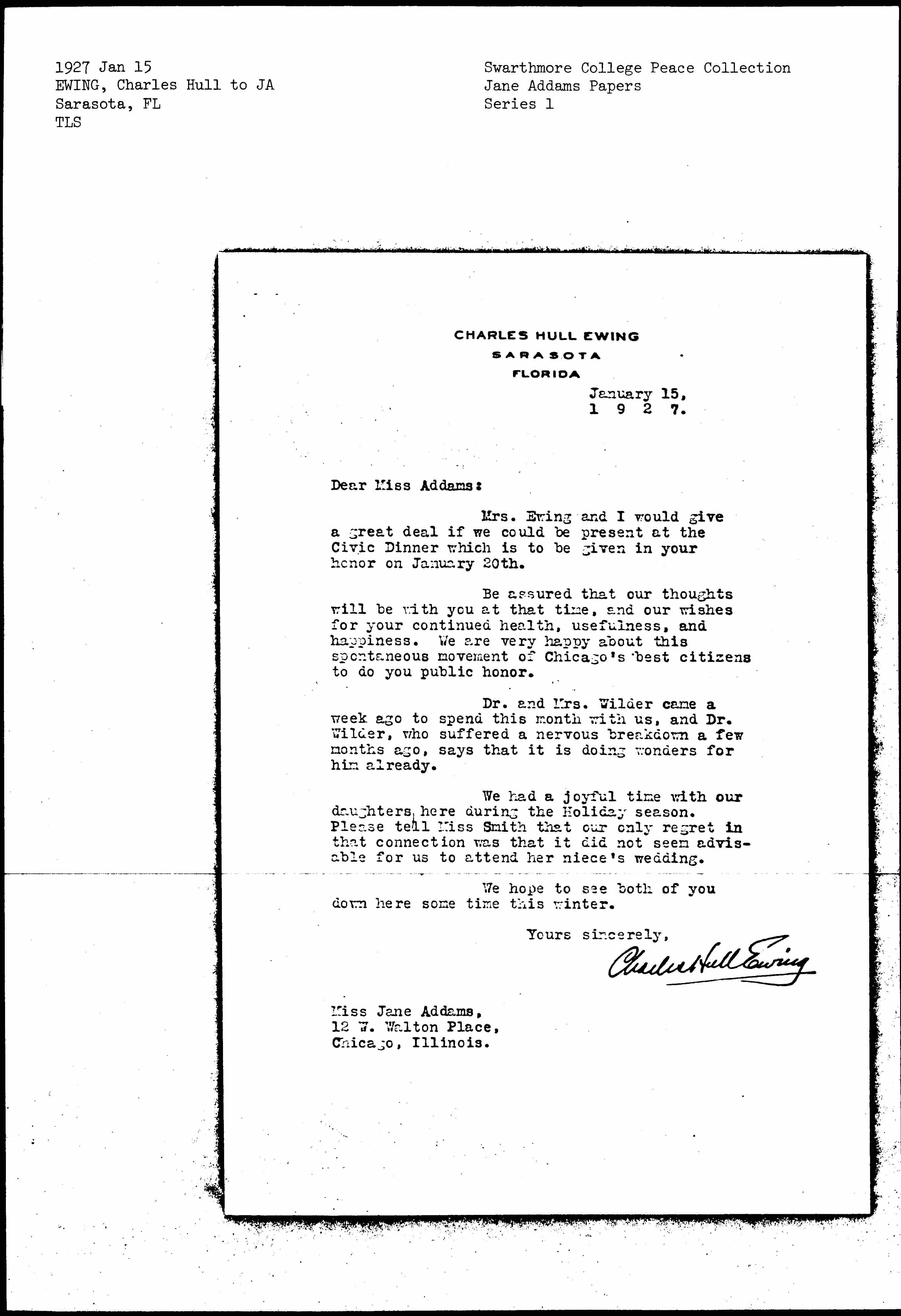 Mrs. Ewing and I would give a great deal if we could be present at the Civic Dinner which is to be given in your honor on January 20th.