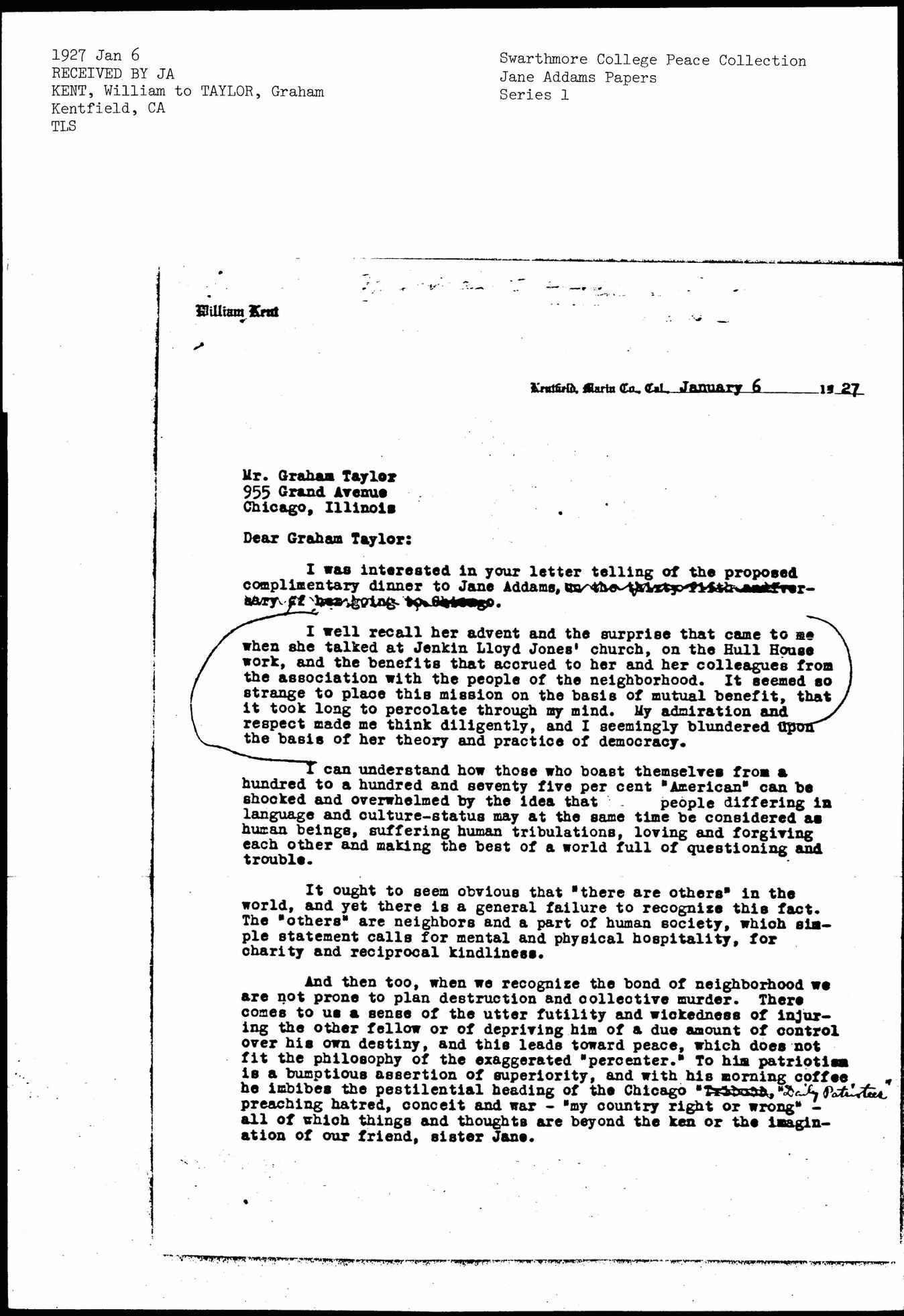 I was interested in your letter telling of the proposed complimentary dinner to Jane Addams, on the thirty-fifth anniversary of her going to Chicago.