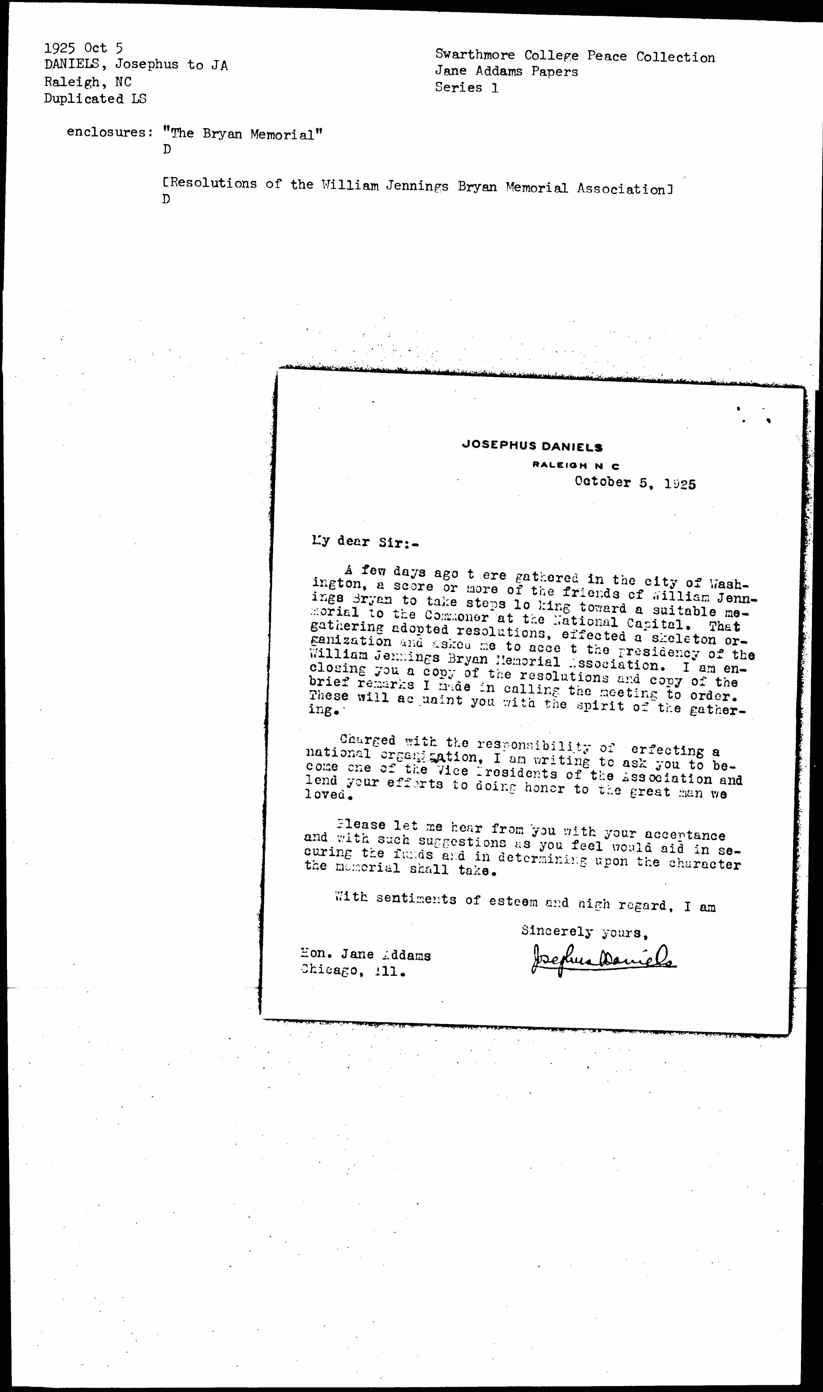 A few days ago there gathered in the city of Washington, a score or more of the friends of William Jennings Bryan to take steps looking toward a suitable memorial to the Commoner at the National Capital. That gathering adopted resolutions, effected a skeleton organization and asked me to accept the presidency of the William Jennings Bryan Memorial Association. I am enclosing you a copy of the resolutions and copy of the brief remarks I made in calling the meeting to order. These will acquaint you with the spirit of the gathering.