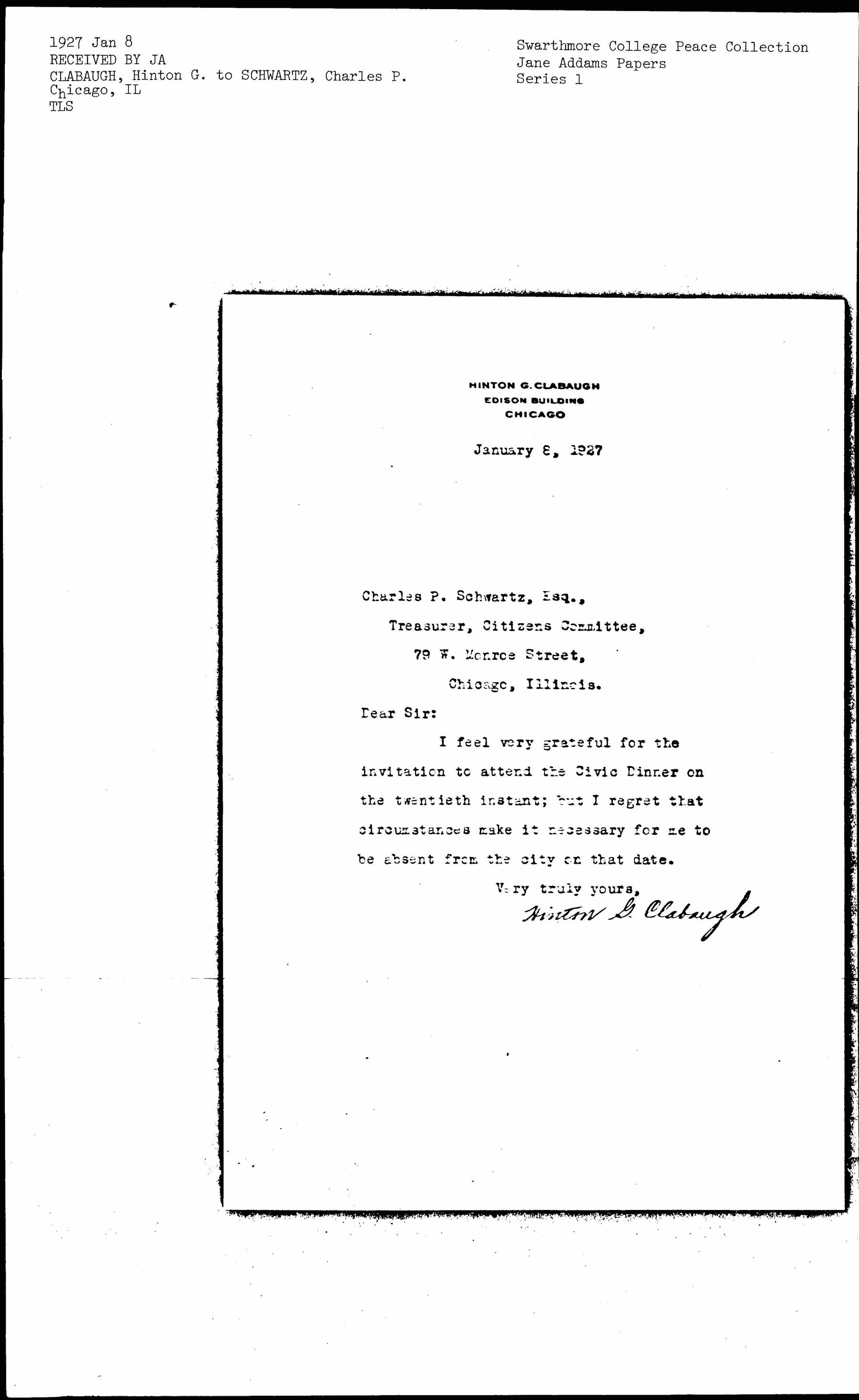 I feel very grateful for the invitation to attend the Civic Dinner on the twentieth instant; but I regret that circumstances make it necessary for me to be absent from the city on that date.