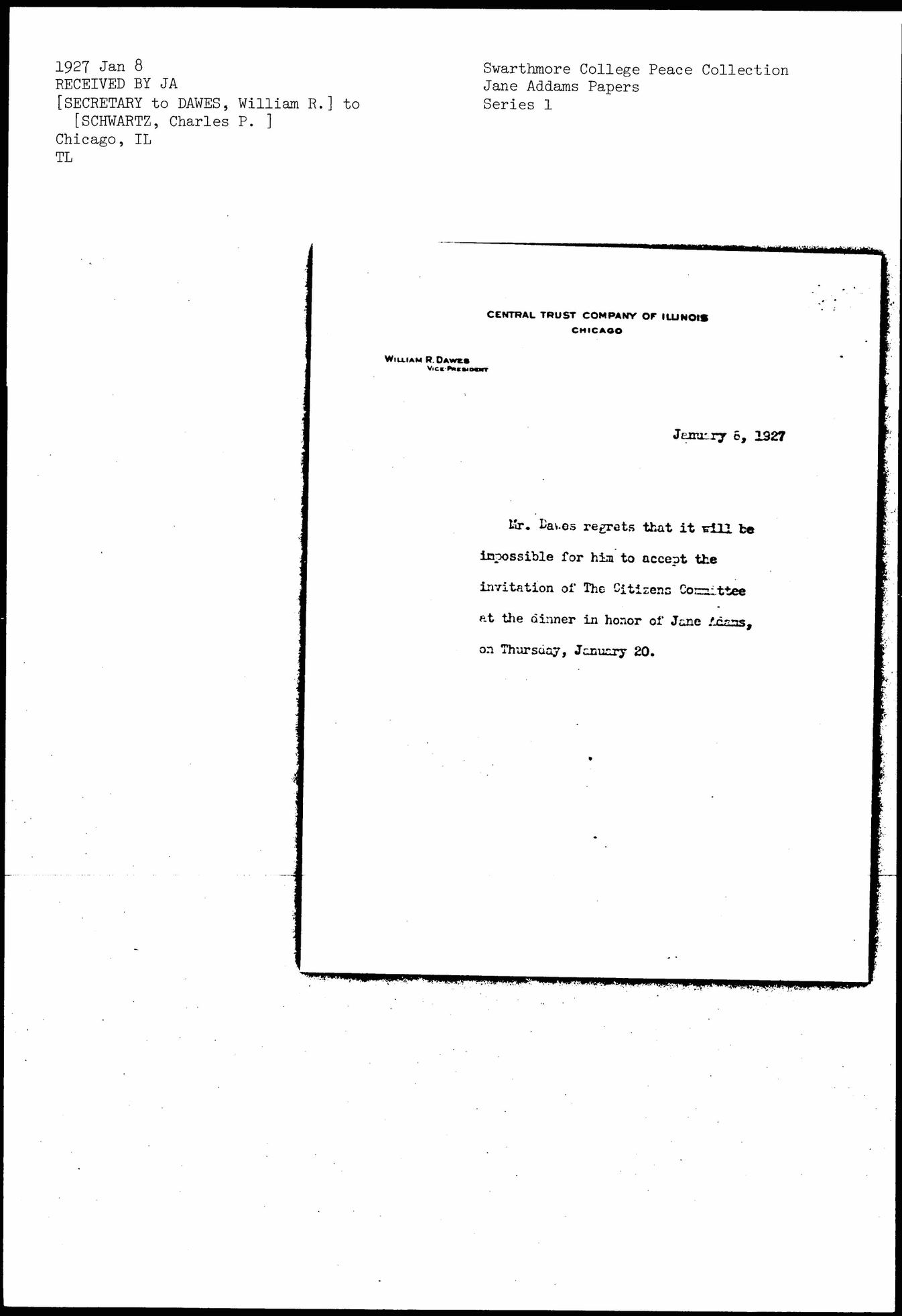 Mr. Dawes regrets that it will be impossible for him to accept the invitation of The Citizens Committee at the dinner in honor of Jane [Addams], on Thursday, January 20.