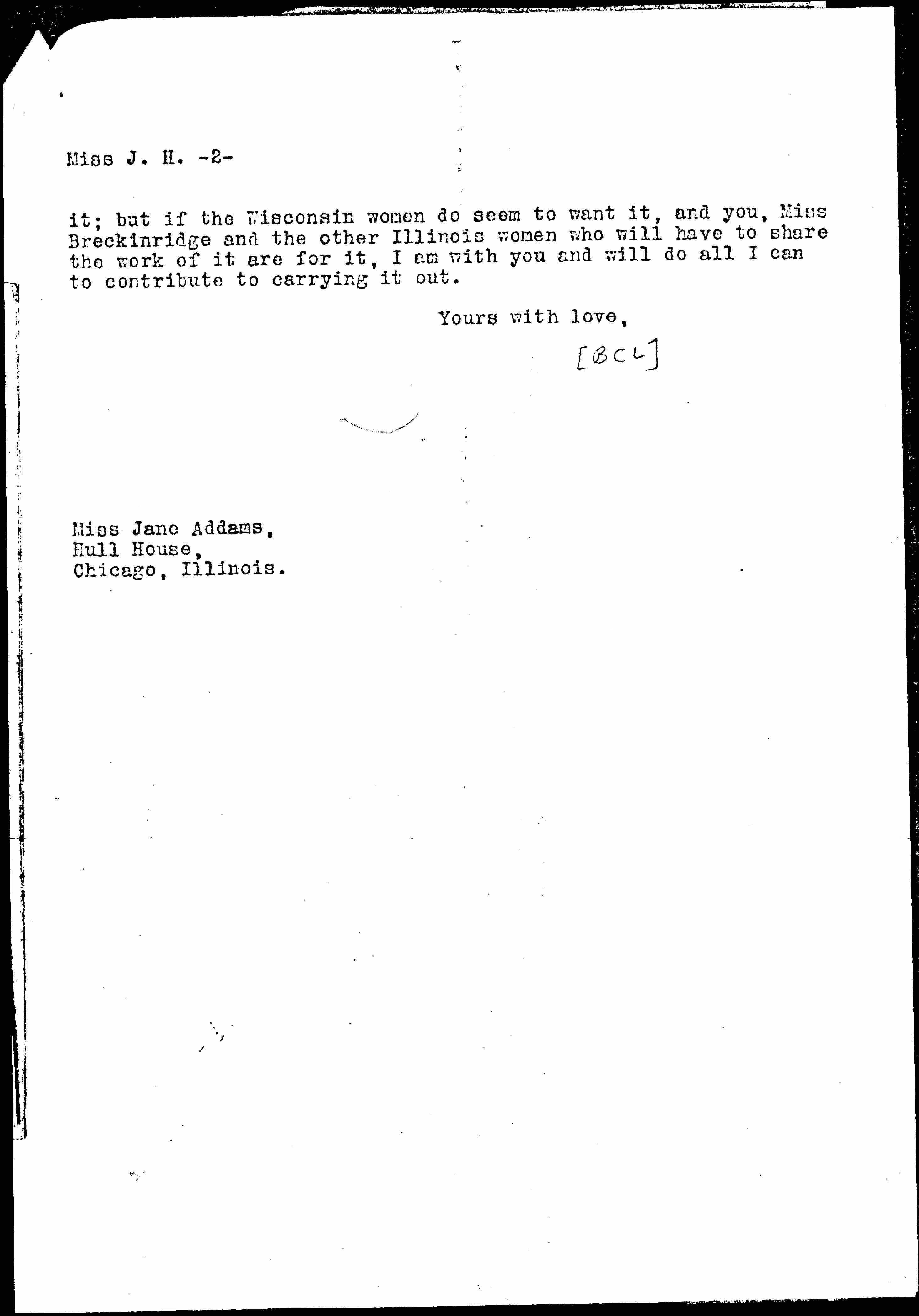 Being right here in Washington, and because Mr. La Follette is in the Senate, it is natural that suffrage workers here and over the country should expect anyone holding a position on the Board to go before committees, give talks and aid in the general work of organization. You can understand better than I can explain how this operates. I ought to have foreseen the difficulties, but this phase of the question did not occur to me. The only inducement to me was that perhaps I might do more for Wisconsin if I accepted the position. I didn't realize how inseparable the responsibilities of such a Board must necessarily be. I see quite clearly now that I can be of quite as much service to Wisconsin off the Board as on, especially since I have talked with you and Miss Breckinridge and find that you feel about the state just as I do; and you really are in closer touch than I can be for the next few months. The advantage of holding the national convention in Milwaukee seemed very great to me. It would, of course, be lots of work, but it seems to me the big card to play. With the help of the Illinois women, who know the state, and with your own wise management and ever-helpful influence, I do not believe there is any great danger of roorbacks. Anyway that is a chance of politics. If we would accomplish anything, we must take some risk. It seems to me the convention would at once awaken state and municipal pride in Milwaukee, where we need it, and would help immensely in giving publicity to our cause. Just an announcement that it was going to be held made in all the local papers would fix the people's attention on the referendum. There would be a general belief that the Association had faith in the state, and has selected Wisconsin as a winner. We would get a great deal of the right sort of advertising from the day the announcement was made until the convention was held. It would create sentiment and good will, and would give all the workers and organizers a common ground of appeal. To have the best results, the invitation should appear to come spontaneously from the state itself, and the Milwaukee women ought to be back of it heartily. I feel, too, that it must have your genuine, inner approval. I am not writing this to persuade you, but simply to give you my point of view. If, after a full consideration, with your closer contact with the situation, you believe it unwise to undertake it, I would by no means urge [page 2] it; but if the Wisconsin women do seem to want it, and you, Miss Breckinridge and the other Illinois women who will have to share the work of it are for it, I am with you and will do all I can to contribute to carrying it out.