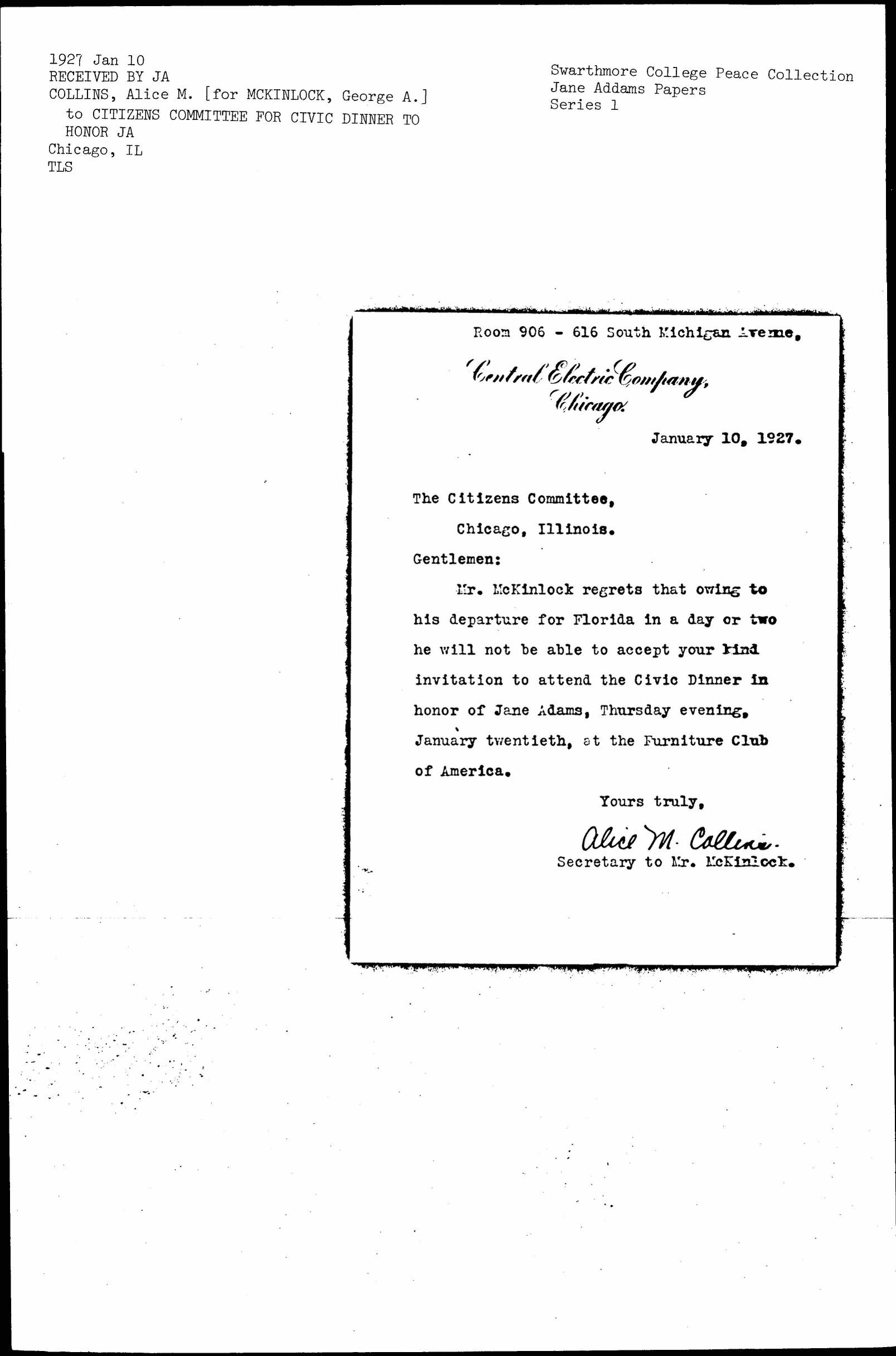 Mr. McKinlock regrets that owing to his departure for Florida in a day or two he will not be able to accept your kind invitation to attend the Civic Dinner in honor of Jane [Addams], Thursday evening, January twentieth, at the Furniture Club of America.