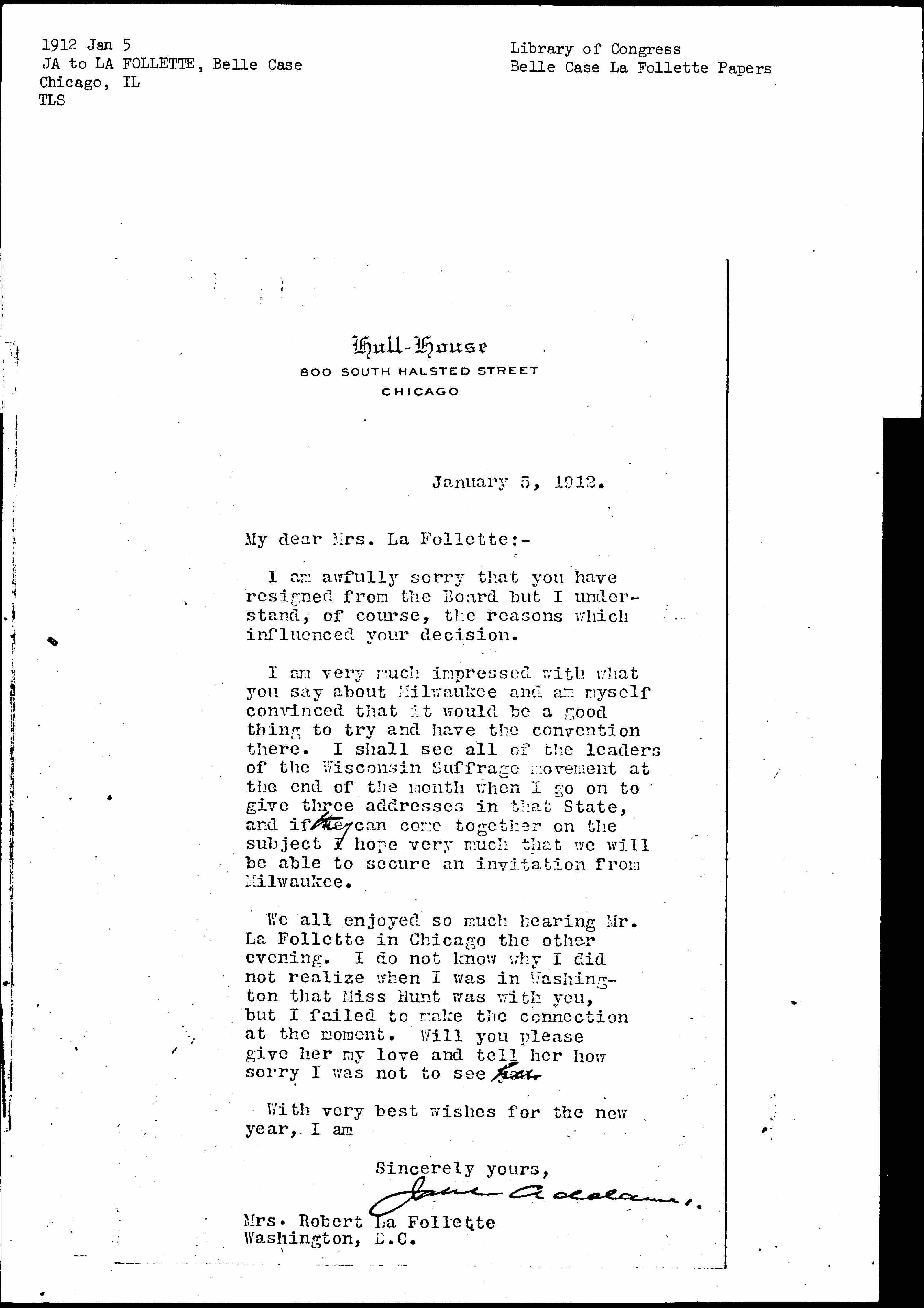 We all enjoyed so much hearing Mr. La Follette in Chicago the other evening. I do not know why I did not realize when I was in Washington that Miss Hunt was with you, but I failed to make the connection at the moment. Will you please give her my love and tell her how sorry I was not to see her.
