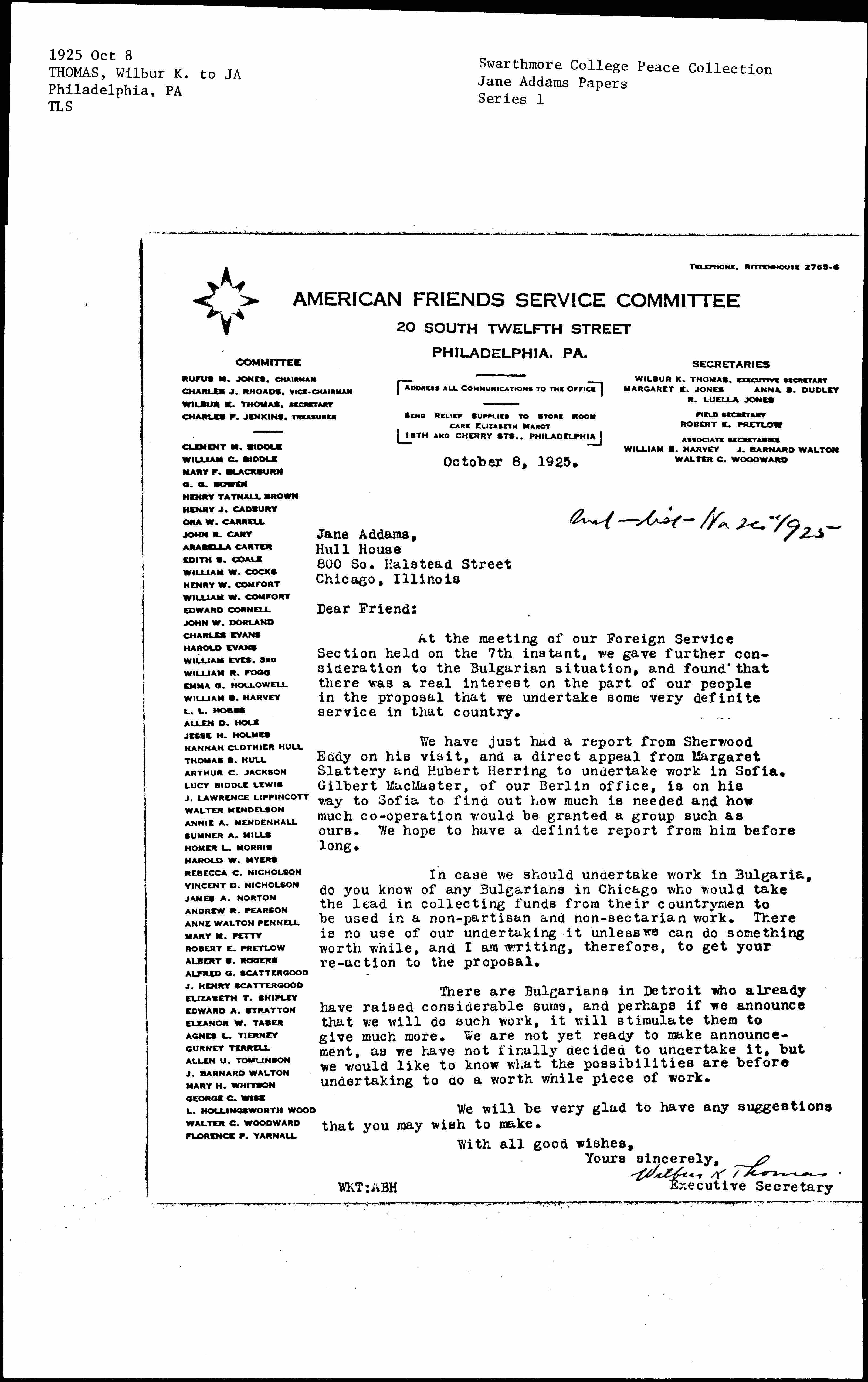 In case we should undertake work in Bulgaria, do you know of any Bulgarians in Chicago who would take the lead in collecting funds from their countrymen to be used in [nonpartisan] and [nonsectarian] work. There is no use of our undertaking it unless we can do something worth while, and I am writing, therefore, to get your [reaction] to the proposal.