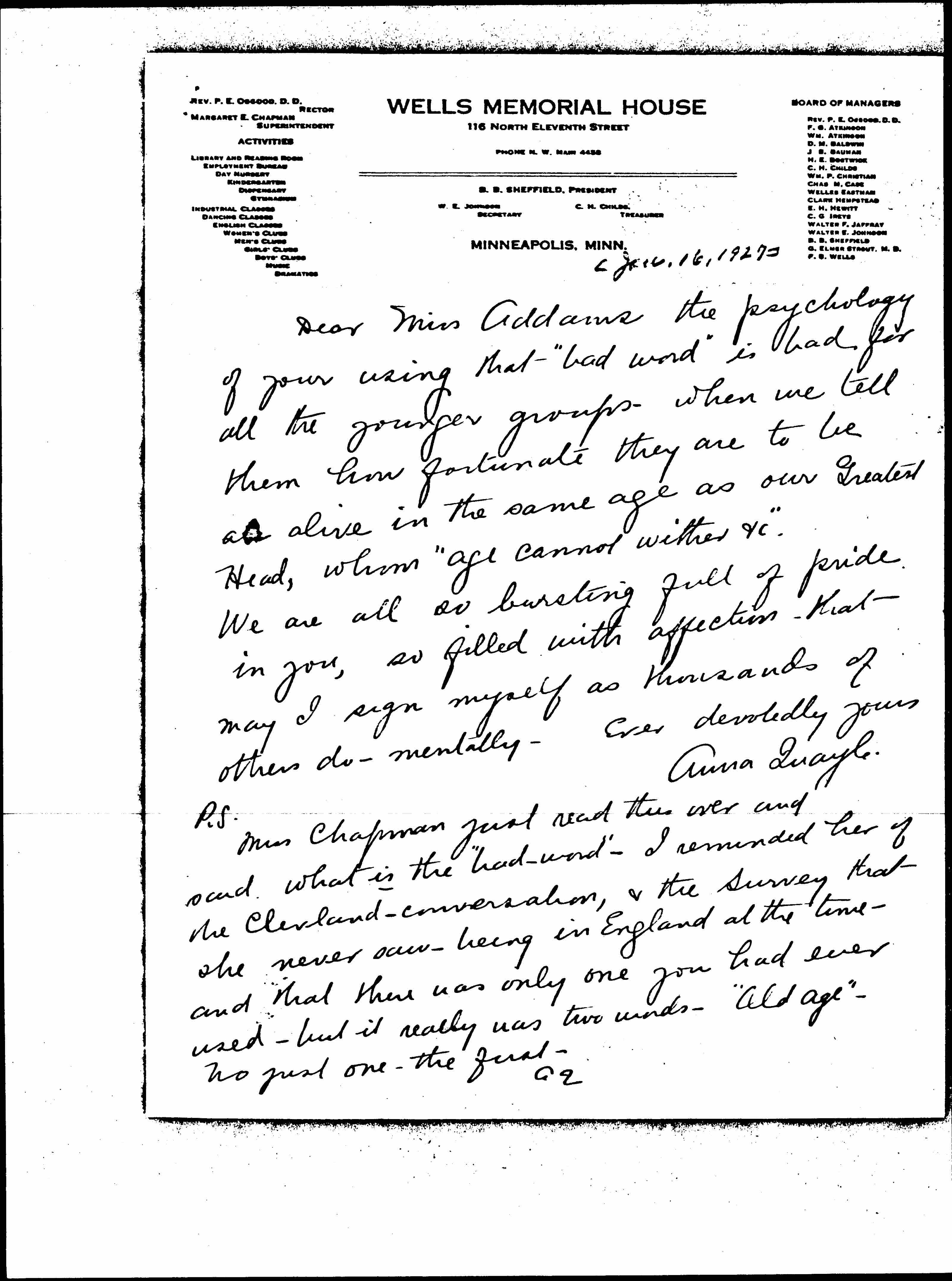 Dear Miss Addams the psychology of your using that "bad word" is bad for all the younger groups -- when we tell them how fortunate they are to be [all?] alive in the same age as our Greatest Head, whom "age cannot wither [etc.]" We are all bursting full of pride in you, so filled with affection -- that may I sign myself as thousands of others do -- mentally. Ever devotedly yours