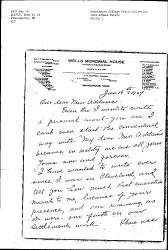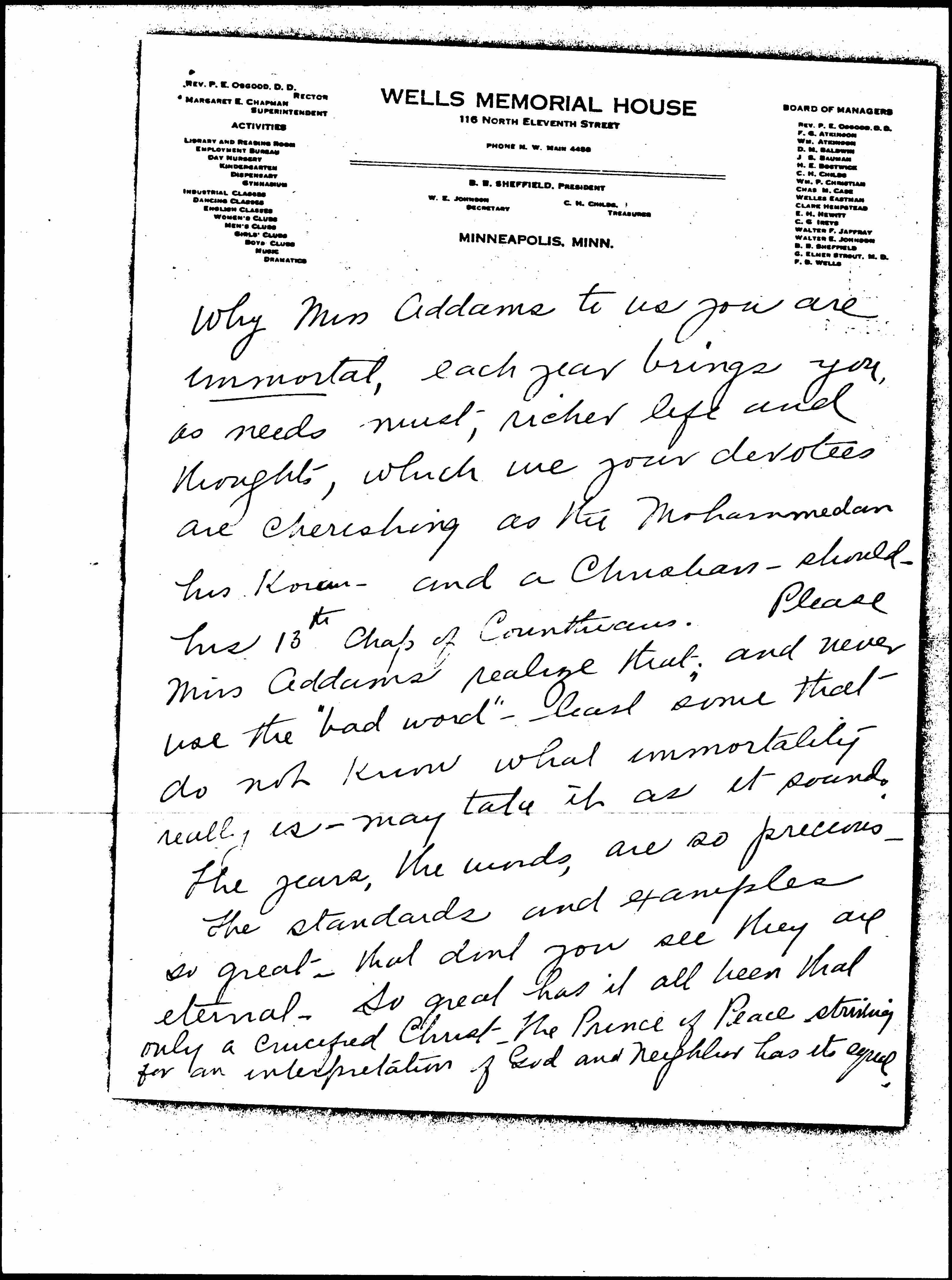 I have wanted to write ever since I was in Cleveland, and tell you how much that convention meant to me, because of your presence, and our renewing, as it were -- our faith in our settlement work. There was [page 2] why Miss Addams to us you are immortal, each year brings you, as needs must, richer life and thoughts, which we your devotees are cherishing as the Mohammedan his Koran -- and a Christian -- should -- his 13th Chap of Corinthians. Please Miss Addams realize that and never use the "bad word" -- least some that do not know what immortality really is -- may take it as it sounds.