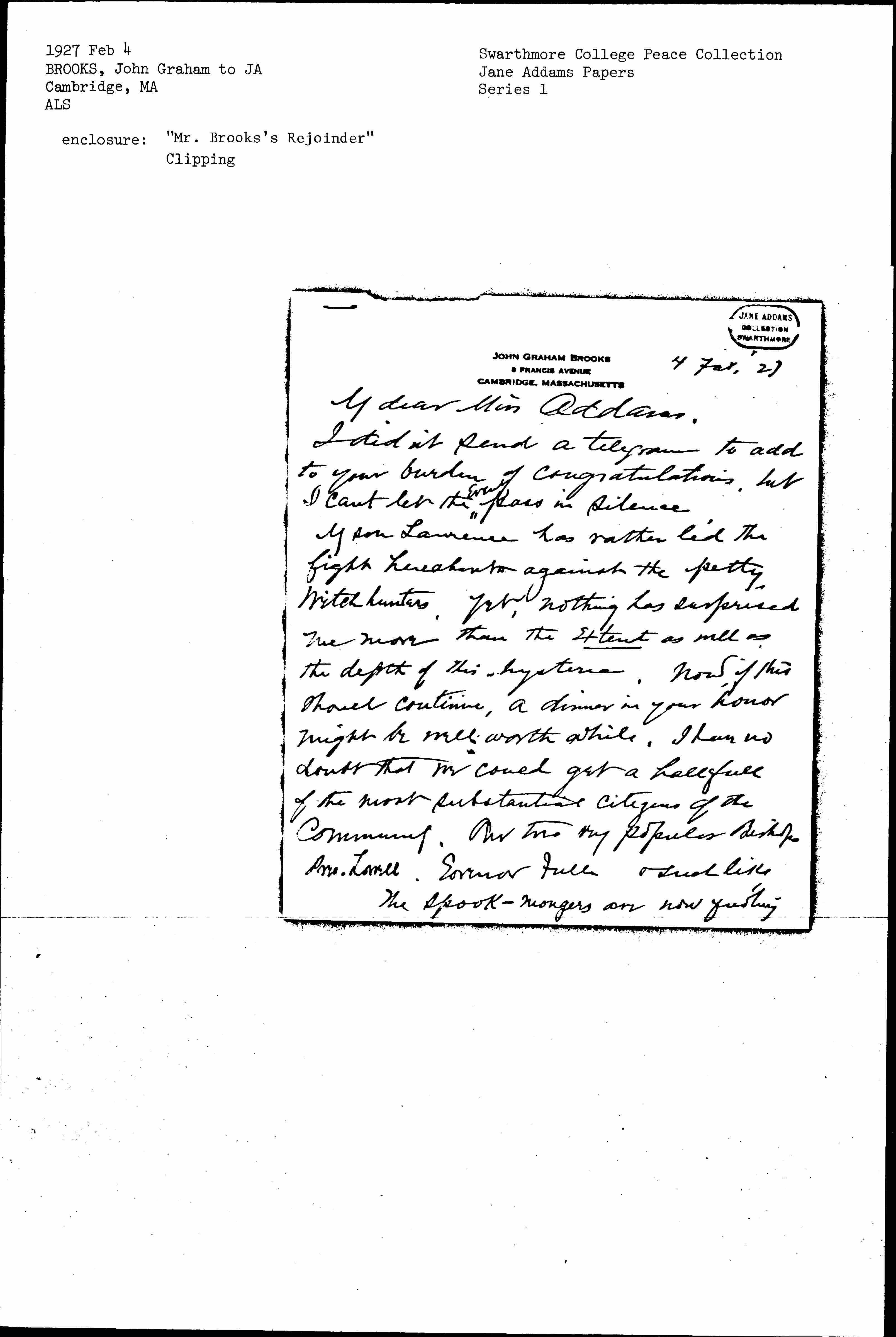 My son Lawrence has rather led the fight hereabouts against the petty witch hunters, yet, nothing has surprised me more than the extent as well as the depth of this hysteria. Now, if this should continue, a dinner in your honor might be well worth while. I have no doubt that we could get a hall full of the most substantial citizens of the community. Our two very popular Bishops, Pres. Lowell, Governor Fuller & such like.
