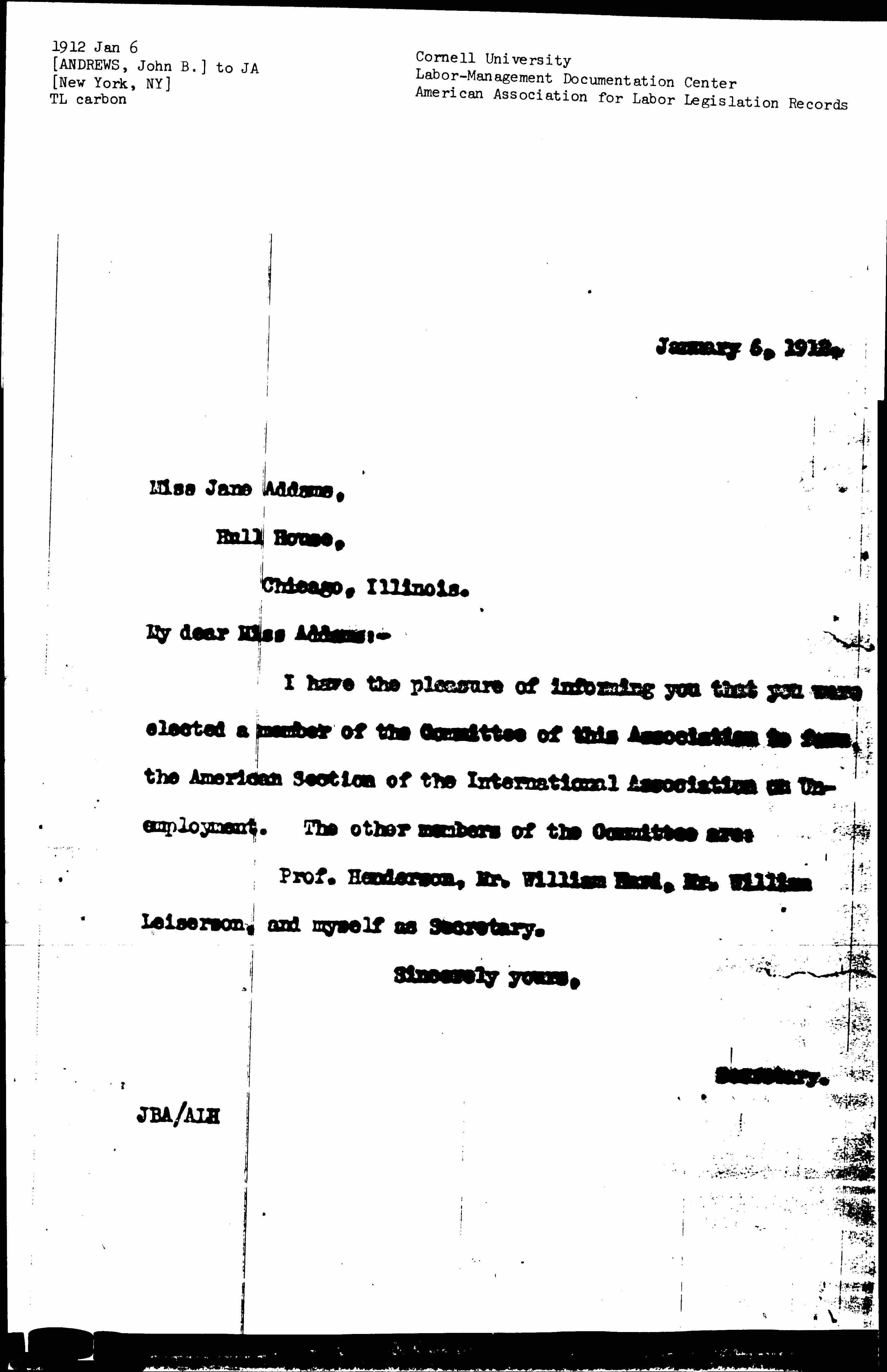 I have the pleasure of informing you that you were elected a member of the Committee of this Association to [form] the American Section of the International Association on Unemployment. The other members of the Committee are: