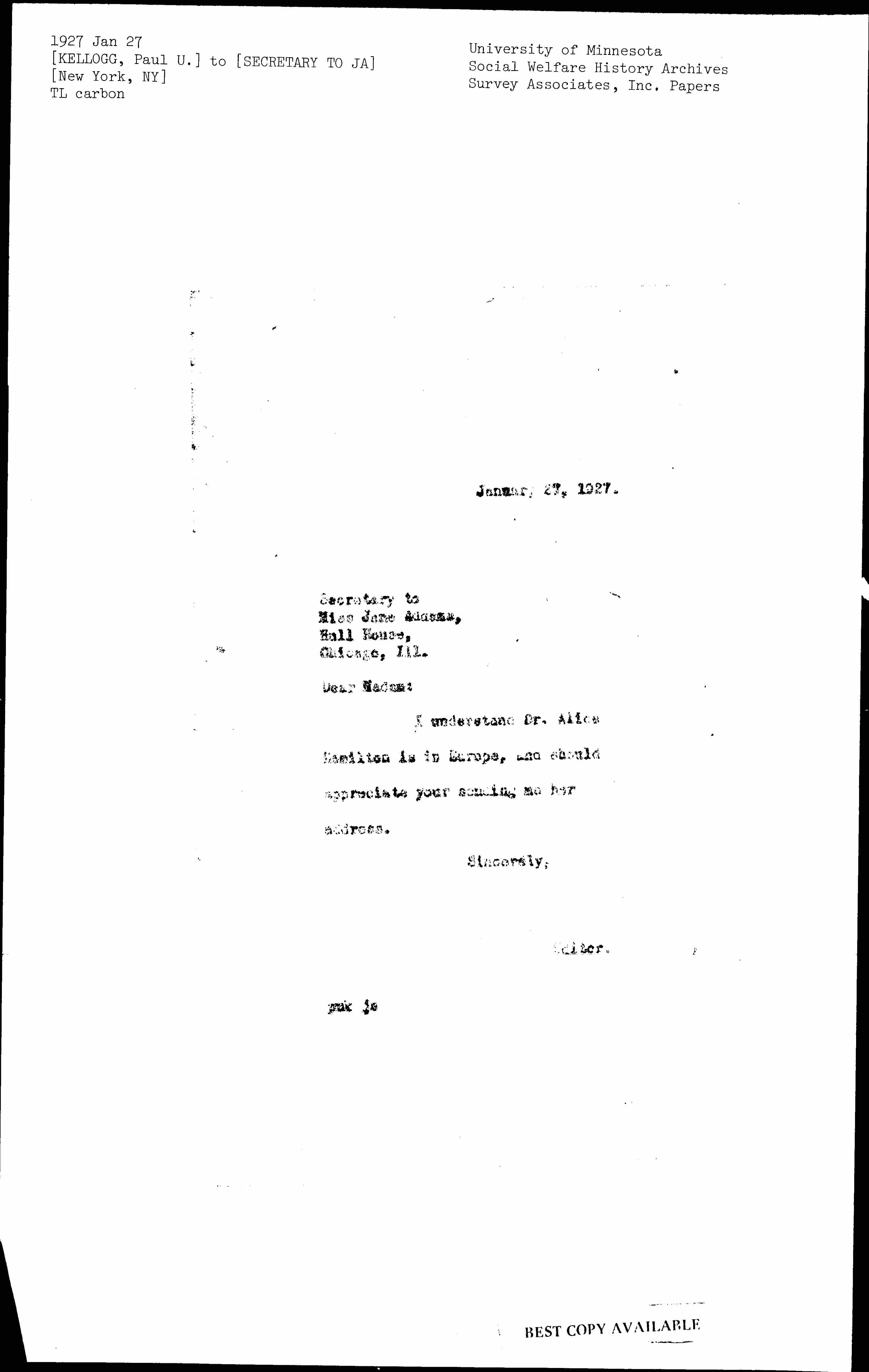 I understand Dr. Alice Hamilton is in Europe, and should appreciate your sending me her address.