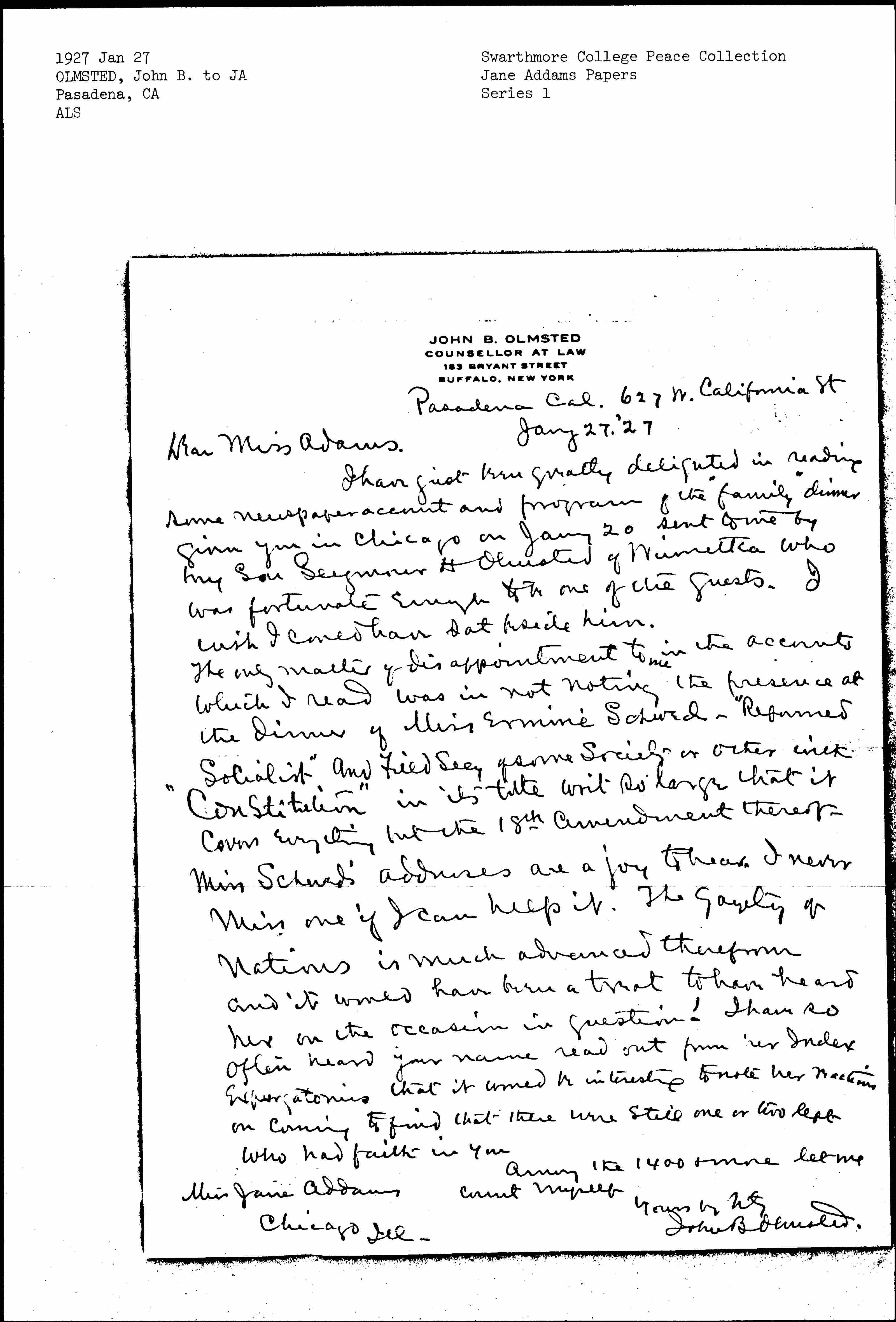 I have just been greatly delighted in reading some newspaper account and program of the "family" dinner given you in Chicago on Jany 20 sent to me by my son Seymour H Olmsted of Winnetka who was fortunate enough to be one of the guests. I wish I could have sat beside him.