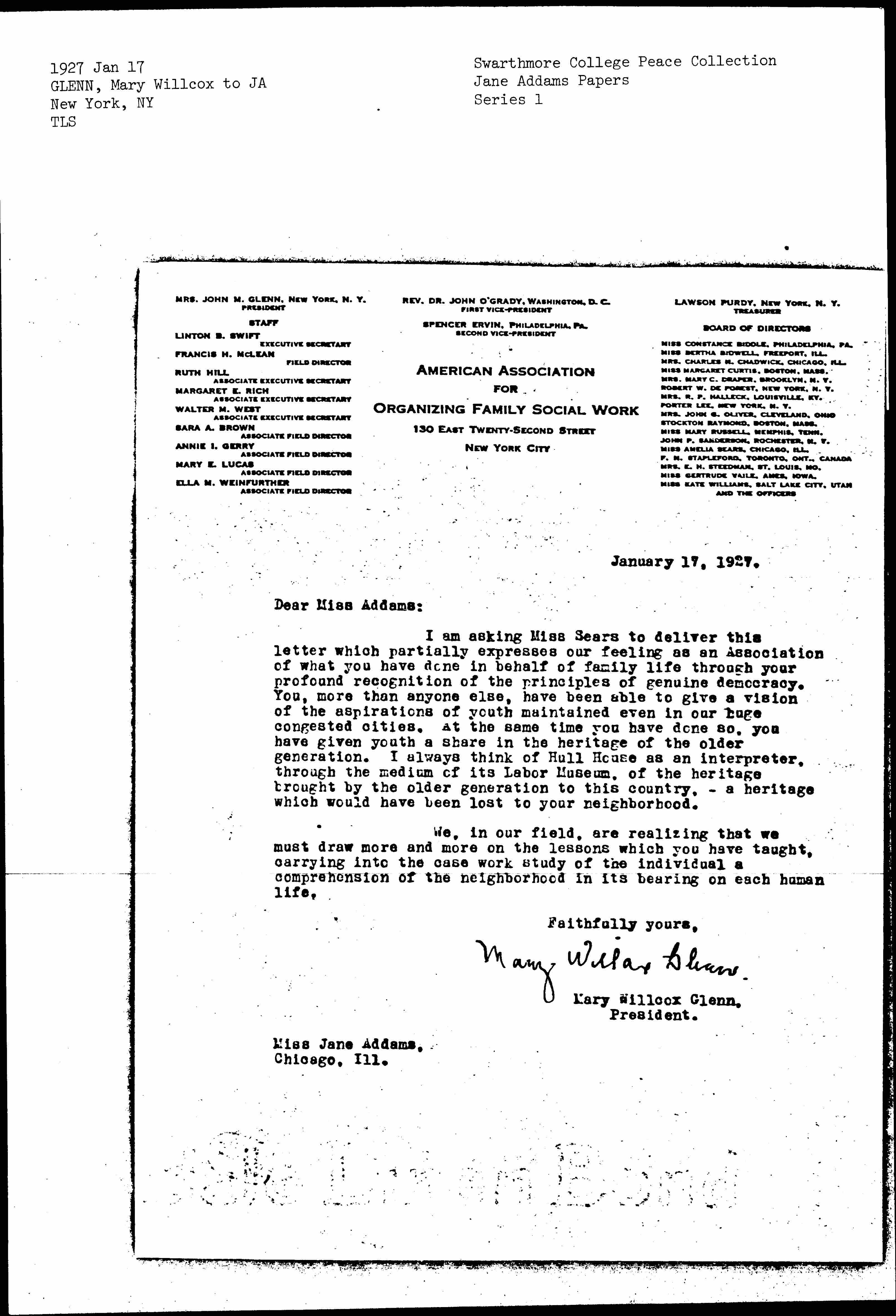 I am asking Miss Sears to deliver this letter which partially expresses our feelings as an Association of what you have done in behalf of family life through your profound recognition of the principles of genuine democracy. You, more than anyone else, have been able to give a vision of the aspirations of youth maintained even in our huge congested cities. At the same time you have done so, you have given youth a share in the heritage of the older generation. I always think of Hull House as an interpreter, through the medium of its Labor Museum, of the heritage brought by the older generation to this country, -- a heritage which would have been lost to your neighborhood.