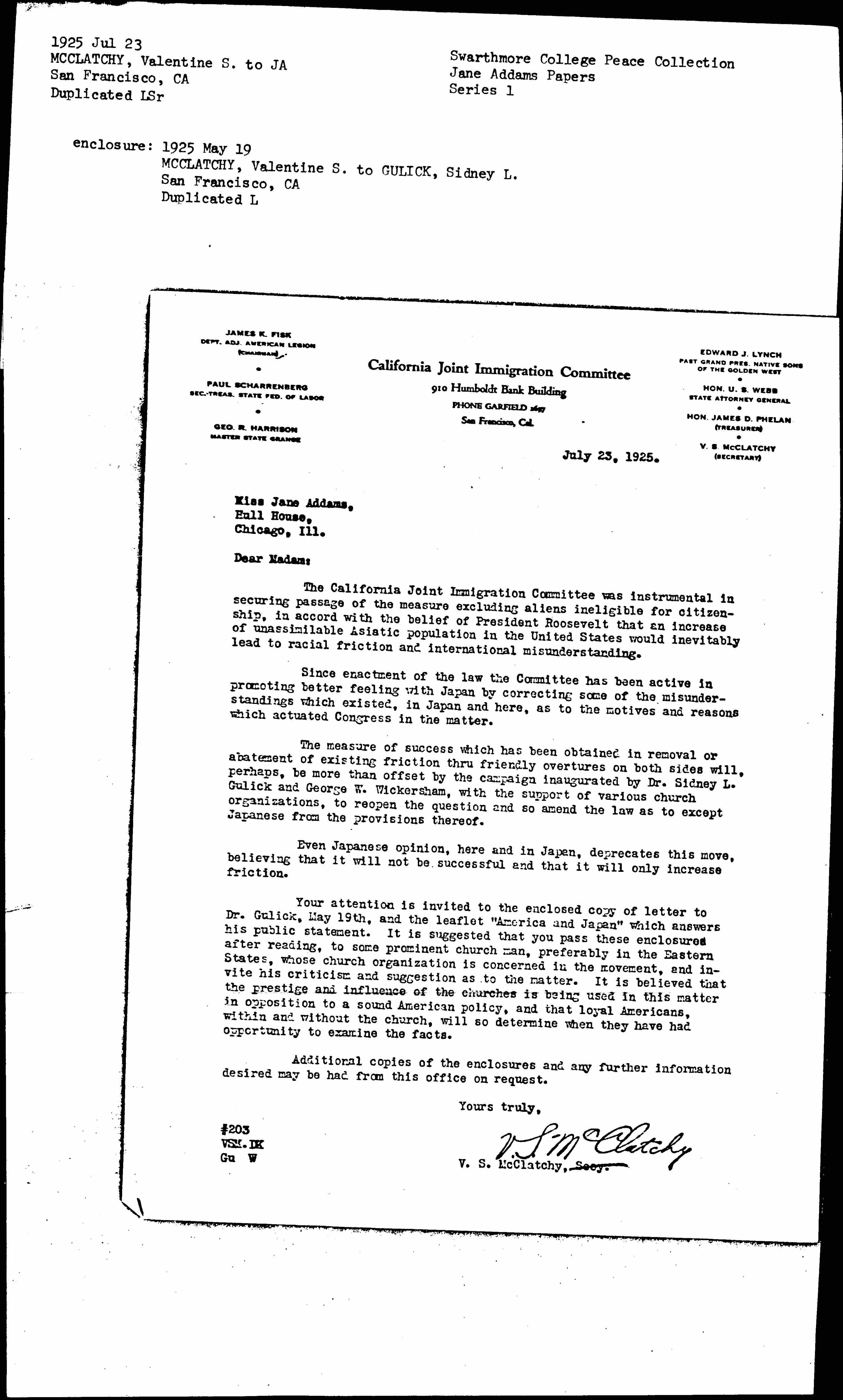 The California Joint Immigration Committee was instrumental in securing passage of the measure excluding aliens ineligible for citizenship, in accord with the belief of President Roosevelt that an increase of unassimilable Asiatic population in the United States would inevitably lead to racial friction and international misunderstanding.