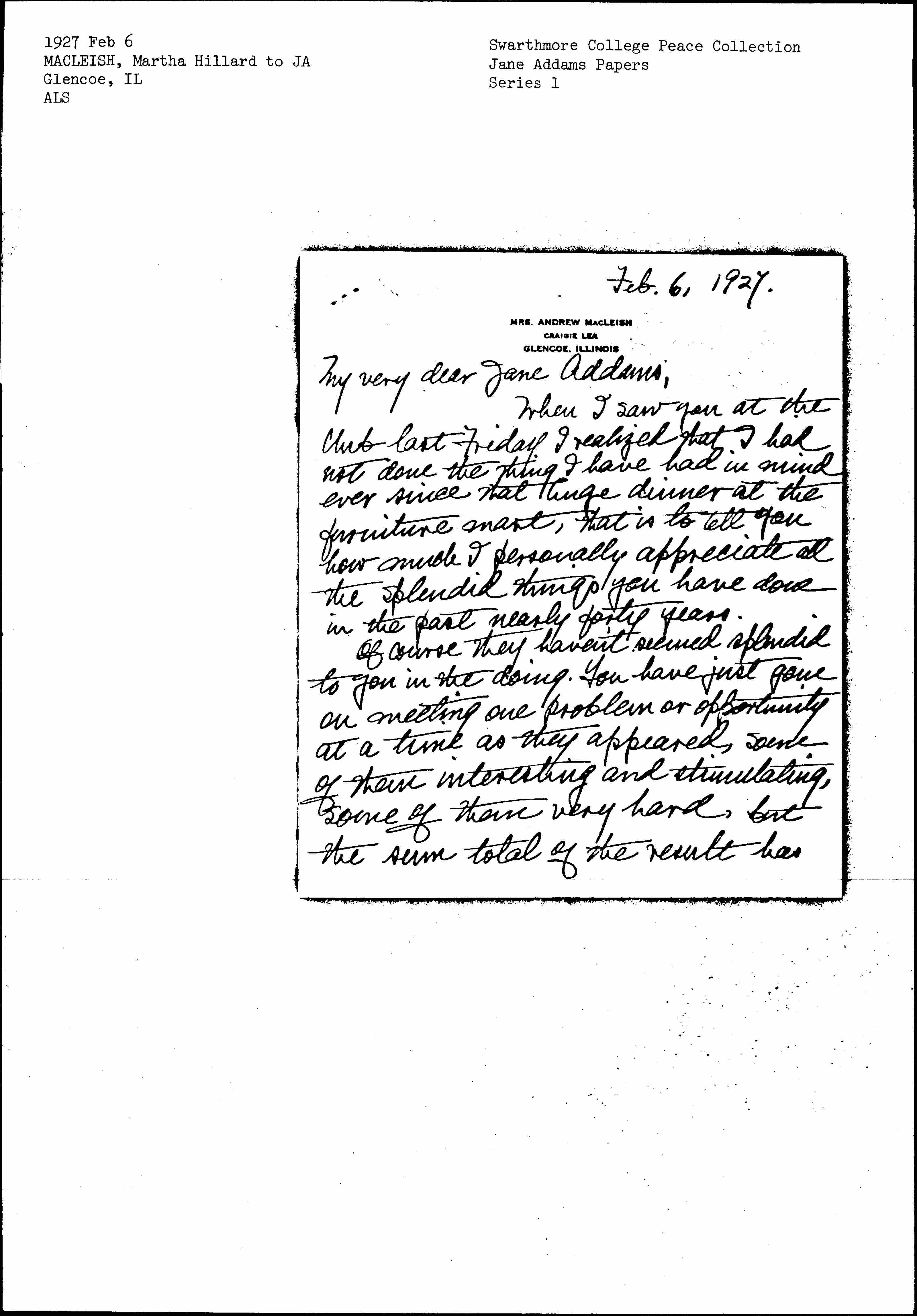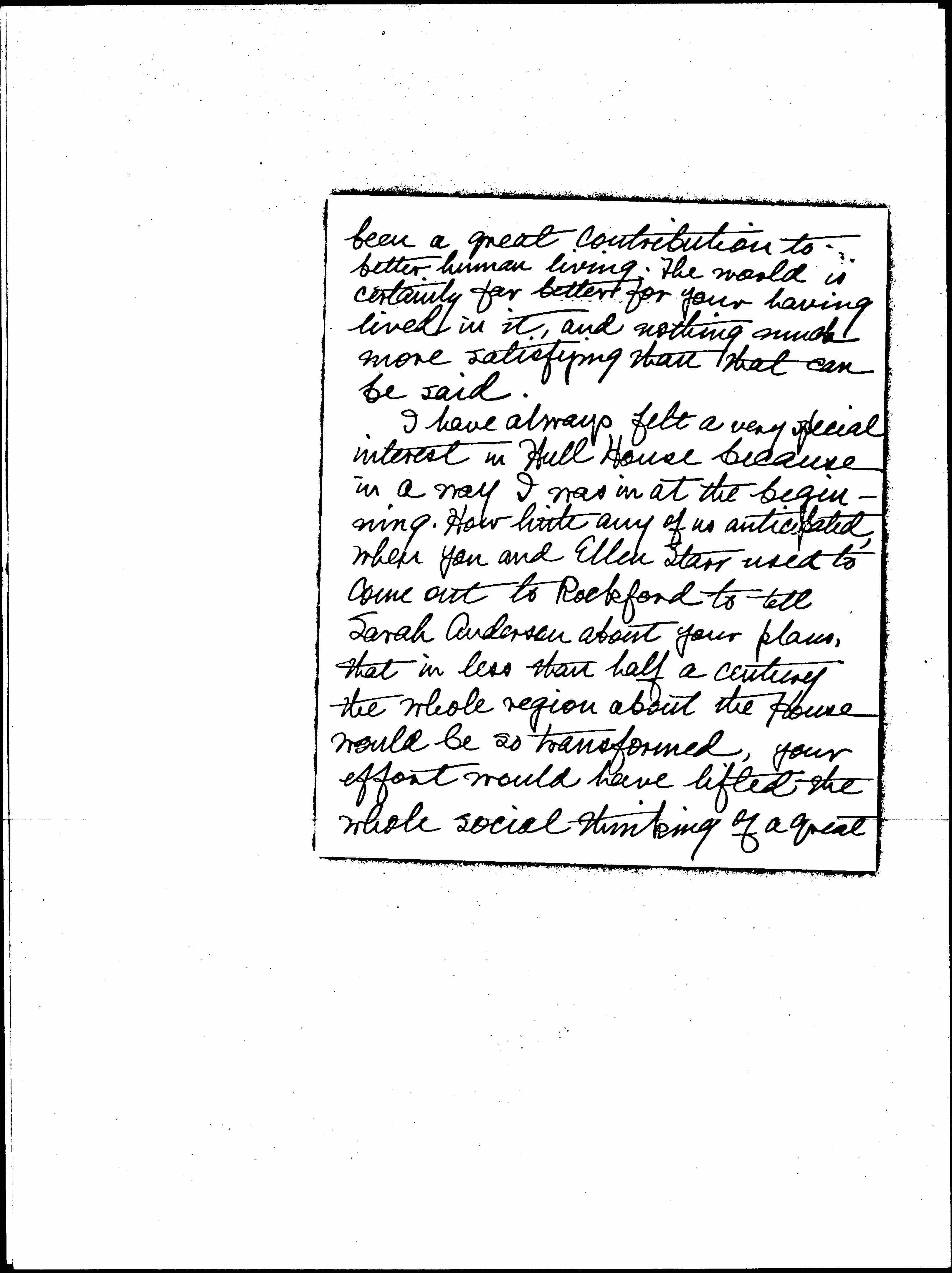 I have always felt a very special interest in Hull House because in a way I was in at the beginning. How little any of us anticipated, when you and Ellen Starr used to come out to Rockford to tell Sarah Anderson about your plans, that in less than half a century the whole region about the House would be so transformed, your effort would have lifted the whole social thinking of a great [page 3] city and you would have become one of the world leaders for human betterment! But that is the way that the steady, true following of a right and noble ideal does work out in this world. That is the way God built the world.